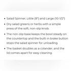 Excellent used condition. Salad Spinner OXO Professional Good Grips XLarge White Soft Non Slip Lid Easy, one handed operation with patented pump mechanism and brake button Soft, non slip knob locks down for storage, and a non slip ring and wide base keep bowl steady on countertop Elegant, clear bowl is perfect for serving, and basket can be used separately as a colander Clear, flat lid allows for convenient stacking when not in use, disassembles for easy cleaning, and parts are top rack dishwasher safe and BPA Free I try to be as detailed as possible in my listings so please read the full description and check all the photos before sending me a message or purchasing. Please refer to the photos for a better understanding of the condition and as a part of the description. Use the MAKE OFFER button to make an offer, I consider all reasonable offers . 1