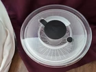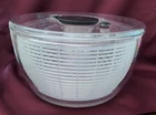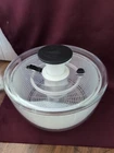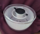 lPre-owned in very nice condition. The OXO Salad Spinner is a kitchen gadget that helps you clean and dry your salad greens, herbs, fruits, and vegetables. It features a clear bowl, a white lid, and a white strainer. The spinner is made of plastic and has a modern style. It is easy to clean and reusable. The item weighs 1 lb 2 oz and has an item diameter and width of less than 10 inches. The item depth is less than 10 inches, and the item height is 5-1/2 inches. Please view pictures for best description. Smoke/pet free inv jbrsh/240521
