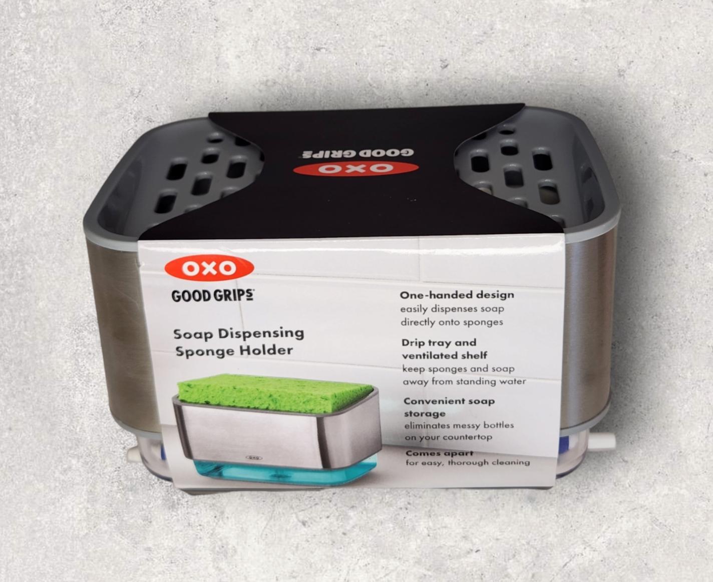 OXO Good Grips Soap Dispensing Sponge Holder One handed design, -Easily dispenses soap directly onto sponge. Drip tray and ventilated shelf, -Keeps sponges and soap away from standing water. Convenient soap storage, -eliminates messy bottles on your countertop Comes apart, -for easy, thorough cleaning. Get soap on demand with a one-handed press.