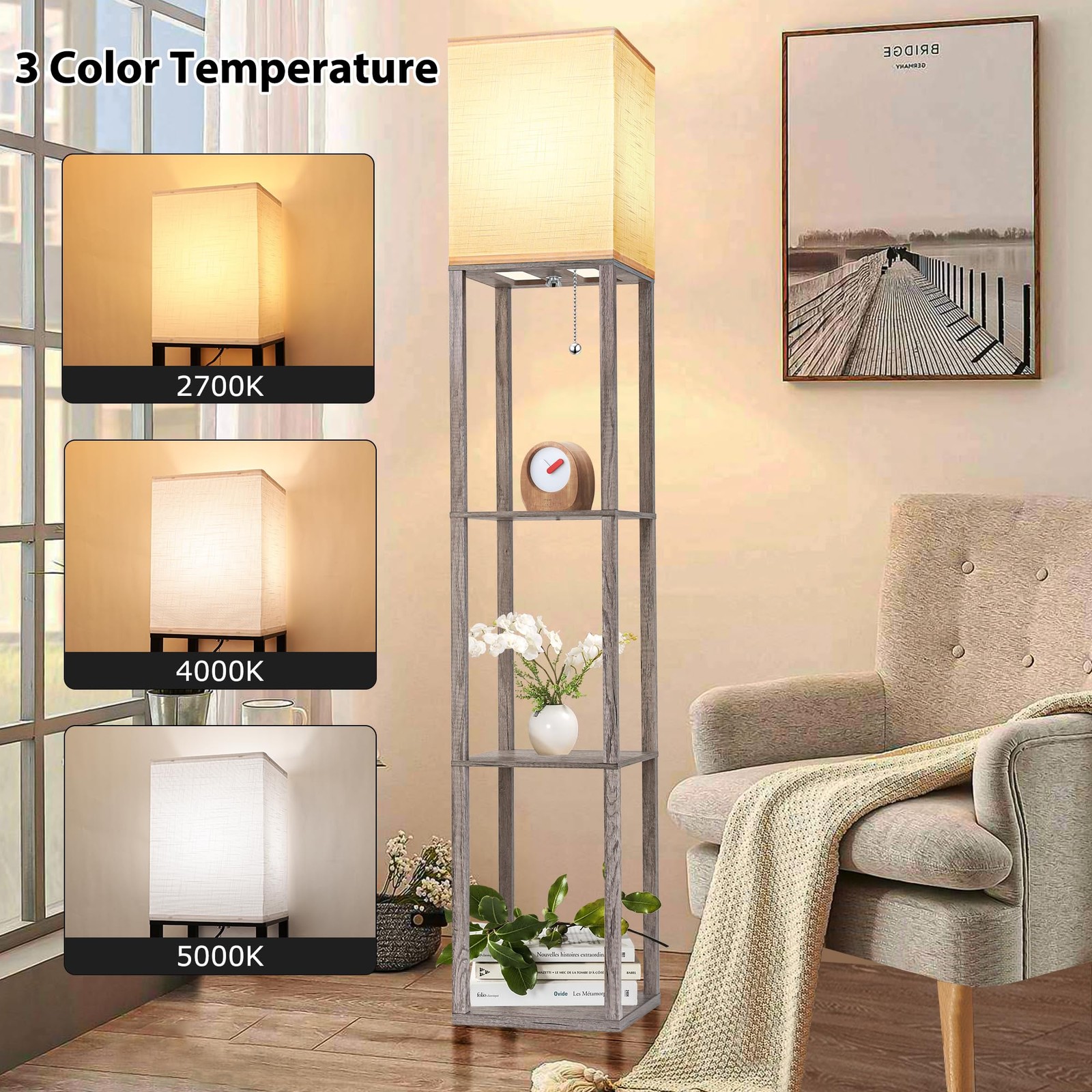 floor lamp with shelves gray Open top design with more brightness: This tall standing lamp assembled size is 10.3" L *10.3" W*63" H. It is designed with open top design to shed more light on your room. 3 color temperature bulb with memory function: shelf lamp includes a 9 Watt, 800 lumen energy saving LED bulb. The LED bulb has 3 color temperatures: 3000K/4000K/5000K. You can switch different color temperatures by pulling the pull chain twice within 10 seconds. Also the led bulb has memory function, it will remember the light color last time you chose. 3 tier storage and display: Our floor lamp with shelves is made of sturdy wood with stable structure, high loading with 50 lbs max loading capacity. This floor lamp adds ambiance to your room and provides a storage or display area for vases, books, plants, albums or other items. Wide application: this shelf floor lamp is a perfect holiday gift and birthday gift for mothers, fathers, wives, husbands, children, and friends. It's suitable for beside a sofa, tv stand, fish tank in the living room, reading in the bedroom or reading room, office, library, kitchen, coffee shop, hotel, restaurant, etc. Assemble easily in 10 mins: the package comes with the tools needed for assembly and an instruction manual containing text and video installation steps. Simply follow the steps to assemble the shleves and poles in 10 minutes.