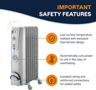 Simple Controls allow you to easily adjust power level and temperature. Up to 20% more efficient* deploy the ComfortTemp feature to automatically maintain the optimal temperature and power levels. *versus using the same unit thermostat at max setting without ComfortTemp Exclusive thermal slot design maximizes heat flow into the room while maintaining a low surface temperature Better Heating- delivers gentle heat minimizing dry air, creating a better breathing environment that is more allergy friendly with no fan to stir up dust, pollen and dander. Integrated handle and control panel allow you to easily operate and relocate your heater during or after use. No Installation Required: A comfort hold handle paired with exclusive smart snap wheels, built-in for convenience, provide out-of-the-box easy movement from room to room as needed. 1500 watts of Long lasting, quiet heat for small to medium spaces Built-in Safety Elements: Thermal cut-off, fully enclosed heating elements, and gently rounded design. Additionally, when the temperature dips below 41 degrees F (5C), the Anti-freeze setting automatically switches on the heater Durable & Low Maintenance: High quality steel assembly and permanently-sealed diathermic oil reservoir never needs refilling. A specialized multilayered painting process provides a complete, corrosive resistant finish. Lower Energy Bills- heat only the room you're in Effectively and efficiently heat any room of the house with the De'Longhi ComforTemp portable oil-filled radiator. Worried about your electric bill? This heater actually saves you money by automatically maintaining the optimal room temperature. Simply press the ComforTemp button for the ultimate in energy savings. The heater even produces the maximum amount of radiant heat while ensuring a low surface temperature, making the radiator a nice choice for homes with pets or kids. The user-friendly control panel offers an adjustable thermostat and three heat settings to customize your heating needs. The anti-freeze setting allows the unit to automatically turn itself on when the temperature drops below 44 degrees F. Safety highlights include rust-resistant durable metal construction, a gently rounded design, and a thermal cut-off function that automatically turns the heater off if it starts to overheat. With its sleek look and silent operation, the De'Longhi oil-filled radiator is the perfect solution to all your heating needs.