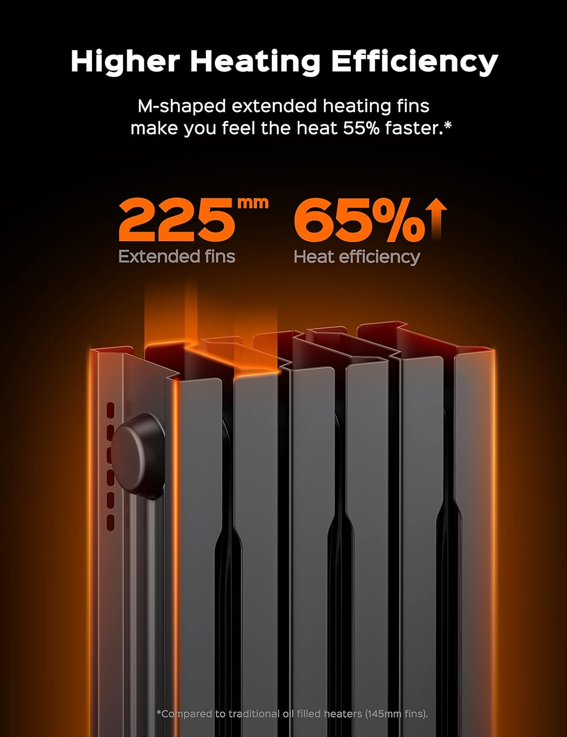 ๐๐๐ง๐ข ๐๐๐๐ฉ๐๐ฃ๐ ๐๐ค๐ง ๐ฌ๐๐ค๐ก๐ ๐ง๐ค๐ค๐ข: 1500W high power, spindle-shaped openings and M-shaped heating fins create stack effect to provide 360ยฐ efficient circulation of hot air in your rooms, keeping your home cozy and warm without drying out the air. Dreo oil radiator heater is your best go-to in winter. ๐๐๐๐ก ๐๐๐๐ฉ ๐๐๐จ๐ฉ๐๐ง: The spindle-shaped openings, 225 mm larger than others enlarged fins and Dual U-shaped heating tubes make the Dreo oil radiator heater so effective in distributing heat that the heat can be doubled and released quickly, evenly and efficiently to a large area or the entire room. ๐พ๐ค๐ค๐ก ๐ฉ๐ค๐ช๐๐ ๐๐๐จ๐๐๐ฃ: With the wraparound heating fins design, the heating element and fins are not directly exposed, preventing burn risks. The exteriors are also specially treated to be only at 80โ at most during use, 30% less hot to the touch than most oil heaters. ๐๐ฃ๐๐๐ฃ๐๐๐ ๐จ๐๐๐๐ฉ๐ฎ: Dreo Oil Filled Radiator Heater made of V0 flame retardant materials was certified by UL. Built-in tip-over switch, Dreo Oil-filled heater will automatically shut off while tip-over by accident to ensure you and your family are safe and worry-free ๐๐ฃ๐๐ง๐๐ฎ ๐๐๐๐๐๐๐๐ฃ๐ฉ: Equipped with 600W/900W/1500W heating modes, this space heater also features a smart ECO mode that adjusts the working mode based on the room temperature with built-in precise temperature sensor, continuously keeping your home in constant warmth while saving more on your energy bills in winter ๐๐๐จ๐ฎ ๐ฉ๐ค ๐ช๐จ๐: A remote is included to allow you to mute, set a timer, and access other functions of this oil-filled radiator heater from 19 feet away. Universal wheels make moving this big guy a breeze. Assembly is super easy โ Just open the bottom brackets and insert the wheels directly. No tools needed ๐๐๐ง๐ข ๐๐๐๐ค๐ง๐ ๐๐ง๐ง๐๐ซ๐๐ฃ๐ ๐๐ค๐ข๐: Dreo oil radiator heater comes with a 24-hour timer, you can set the timer in 1 hour increments. Not only can you set the auto off time, you can also set the auto on time while on standby. Always stay warm when at home Product Description Dreo is a sustainable lifestyle. Our team is committed to helping people enjoy home lives in a fun and sustainable way. Every day we put customers at the core of everything and seek to create value for people's lives by harnessing the latest smart home technologies in the most unexpected ways. At Dreo, we are always in pursuit of something better. Tip Over Switch Overheat Protection Wraparound Protection UL Certification 4 Heating Modes Upgrade Oil filled Radiator Heater Dreo oil-filled radiator heater is the ultimate all-rounder that gives you maximized warmth and comfort when the winter storm strikes. Sleek and modern, this heater uses extended fins and spindle-shaped openings to ensure a wide and even spread of warmth across your home. With a host of settings, this heater optimizes the efficiency to reduce your heating bills on cold days. If youโre looking for a stylish, powerful and energy-efficient heater, Dreo oil-filled heater is your ideal choice. Spindle-Shaped Openings M-shaped Heating Fins 225mm Enlarged Fins Wraparound Heating Fins Design Remote Control ECO Mode 24 Hours Auto On/Off Timer Easy Operation Straightforward LED display and control panel offer a wide range of cutomizations in thermostat (40-95โ), timer (1-24h), heating mode (1500W/900W/600W/ECO), child lock and more. Control from Sofa or Bed Remote control provides 19-feet access to all the functions of your heater. The mute function enables you to turn off the button sound at any time. Just sit back and embrace the warmth. 4 Heating Modes Dreo oil filled radiator heater comes with 3 working modes (Low:600W; Med:900W; High:1500W) and an extra ECO mode to personalize your warmth during chilly days while preventing sky-high energy bills. Moves in All Directions The recess at the oil heater back makes it easier to pull or push. With the universal wheels you can move the dreo oil heater to anywhere you want like garage, basement and so on Tool-Free Assembly The package contains 4 casters that make your heater stand stable and convenient to move around. Just pull apart the bottom brackets, insert the casters, and press them into the holes. No tools needed! Premium Diathermic Oil The internal oil features high purity. It neither ignites at 446ยฐF nor loses its flowability even at -0.4ยฐF. This space heater is completely sealed and the oil never evaporates or disappears. No refill and change needed forever.