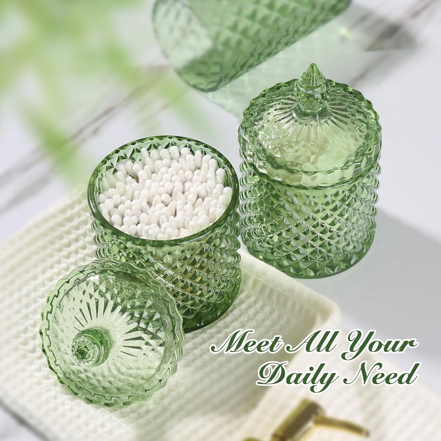 Pack Include: Cotton Swab Holder, Toothbrush Holder, Cotton Ball Holder, Soap Dispenser. Green Bathroom Accessories Set, 4 Pack Olive Green Bathroom Decor Accessory Sets Complete, Diamond Glass Soap Dispenser and Toothbrush Holder Set for Bath Counter Organizer Essentials 【ATTRACTIVE 4 PACK GREEN BATHROOM ACCESSORIES】 Get these DIAMOND STYLE elegant additions to your bathroom right now! Let these green bathroom accessory set brighten your bathroom nicely! This green bathroom decor is perfect for every bathroom theme no matter boho, modern, farmhouse, vintage, and western, you name it! You would get a SOAP DISPENSER, a TOOTHBRUSH HOLDER, a QTIP HOLDER, and a COTTON BALL HOLDER in just ONE set! 【GORGEOUS DIAMOND PATTERN DESIGN】Diamond is a symbol of purity and magnificence. Such a diamond-style glass olive green bathroom accessories set could be easily suitable for your bathroom themes. Brighten up your bathroom space in a way that’s as unique as you are. Each green bathroom set accessories is handcrafted by experts, and each diamond pattern on it is equally sparkling, not only in your bathroom but also in the eyes of every guest who enjoys it. 【STURDY GREEN GLASS MATERIAL】All these green bathroom accessories sets complete are made of high-quality green glass. Elegant, sturdy, and heavy-weighted. Not easy to be broken or tip over. Let those plastic inferior bathroom accessories sets leave your bathroom, and let this green bathroom soap dispenser and toothbrush holder set complement your bathroom vanity decor. 【PRACTICAL FOR USE】If you are a person who loves enjoying life, you would find that the green bath accessories sets meet all your daily needs in your life. The 13oz Soap dispenser filled with hand soap/lotion/face wash could be used for a long time. The green bathroom organizer essentials could hold multiple toothbrushes, toothpaste, combs, and shavers at the same time. 2 jars could be used for qtips, cotton balls, cotton swabs, cotton pads, etc. Makes your bathroom look tidy and wonderful. 【WONDERFUL GIFT IDEA & SUPERIOR QUALITY SERVICE】This green bathroom accessories decor set is a great and unique gift for housewarming, wedding, birthday, Mother's Day, Thanksgiving Day for mom, sister, colleague, and friends.