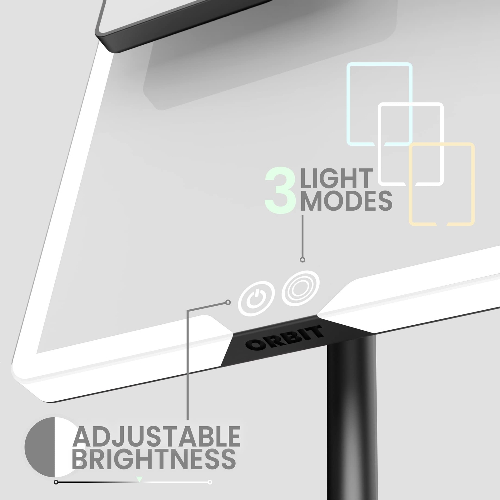 Orbit Mirror | Vanity Mirror with Lights, Makeup Mirror, LED Lighted Desk Mirror with Light for Tabletop 7X 1X Magnification Dimmable and Rechargeable | Phantom Black Product Details Brand: LUNA London Room Type: Bathroom, Dressing Room, Bedroom Shape: Rectangular Product Dimensions: 15.75"L x 7.49"W Frame Material: Aluminum Brand: LUNA London Room Type: Bathroom, Dressing Room, Bedroom Shape: Rectangular Product Dimensions: 15.75"L x 7.49"W Frame Material: Aluminum Style: Modern Mounting Type: Dresser Mount Finish Type: Painted Surface Recommendation: Ceramic Special Feature: Detachable, Rechargeable Battery, Cordless, Color Changing, Magnifying Color: Phantom Black Theme: Modern Specific Uses For Product: Dressing, Home Decor, Makeup Number of Pieces: 1 Number of Items: 1 Material: Aluminum Frame Type: Framed Item Weight: 2.82 Pounds Assembly Required: Yes Frame Color: Chalk Grey Magnification Maximum: 7 x Manufacturer: LUNA London Frame Size: 19cm x 12.5cm x 39.5cm or 7.49 inches x 15.75 inches x 15.55 inches Size: 15.8"L x 7.5"W Item Weight: 2.82 pounds Item model number: LL-005 Batteries: 1 Lithium Polymer batteries required. (included) Date First Available: September 16, 2022 THE COMPLETE VANITY MIRROR - An all-in-one vanity mirror with lights that simulates soft warm, neutral white, or natural daylight to create the perfect light setting for your daily routine. ORBIT is adaptable as a desk mirror for makeup, hair or mens grooming. TALL & ELEGANT - Designed to add elegance to its environment, its 40cm tall, cable-free and streamlined aluminium structure makes it the ideal tabletop mirror that you can place in your bedroom, bathroom or any room where you complete your daily makeup or grooming routine in. MULTI-ROTATIONAL MAGNETIC BALL - It's easy to tilt the large 11 light up mirror face to portrait or landscape. Additionally, you can detach the main led mirror from the magnetic ball to hold it in your hand for tricky high or low angles. 7X & 1X MAGNIFICATION - Includes the Mini ORBIT 7X magnified mirror add on, that magnetically attaches to the main lighted mirror face for more intricate detailing. Wipe rubber surface clean before use to ensure a strong connection. 3 ORBIT COLOUR CHOICES - Make it personal or a perfect gift for women and men by choosing from the selection of ORBIT colours including Blush Rose, Chalk Grey and Phantom Black.