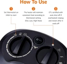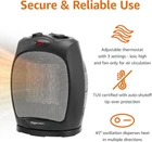 Oscillating Ceramic Space Heater, Portable Heater for Indoor Use, for Office and Home, With Overheat and Tip-Over Protection, Thermostat, 1500W, Black, 7.52"D x 6.34"W x 9.45"H Description: EVEN HEAT DISTRIBUTION: The heater's 45-degree oscillation function ensures even heat distribution across the room, warming a wider area for maximum comfort. CUSTOMIZABLE HEATING OPTIONS: Choose from three settings to suit your needs - High (1500W), Low (900W), or Fan Only for air circulation without heat. COMPACT & PORTABLE: Weighing just 3 lbs and sized at 7.5“L x 6.3”W x 9.5“H, this space heater is easy to move and perfect for your Home, Office. CERTIFIED SAFETY: TÜV-Certified for peace of mind, with built-in Tip-Over Protection, Overheat Protection, and a Power Indicator Light for safe operation. RAPID HEATING TECHNOLOGY: Ceramic heating provides fast and efficient heat in minutes, keeping you warm quickly on cold days. NOT FOR HUMID ENVIRONMENTS: Please avoid using this heater in Bathrooms, Laundry Rooms, or other high-moisture areas.
