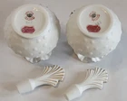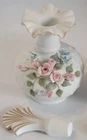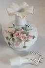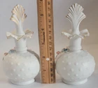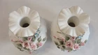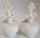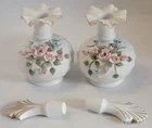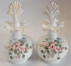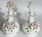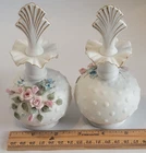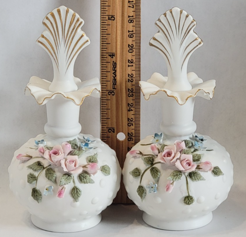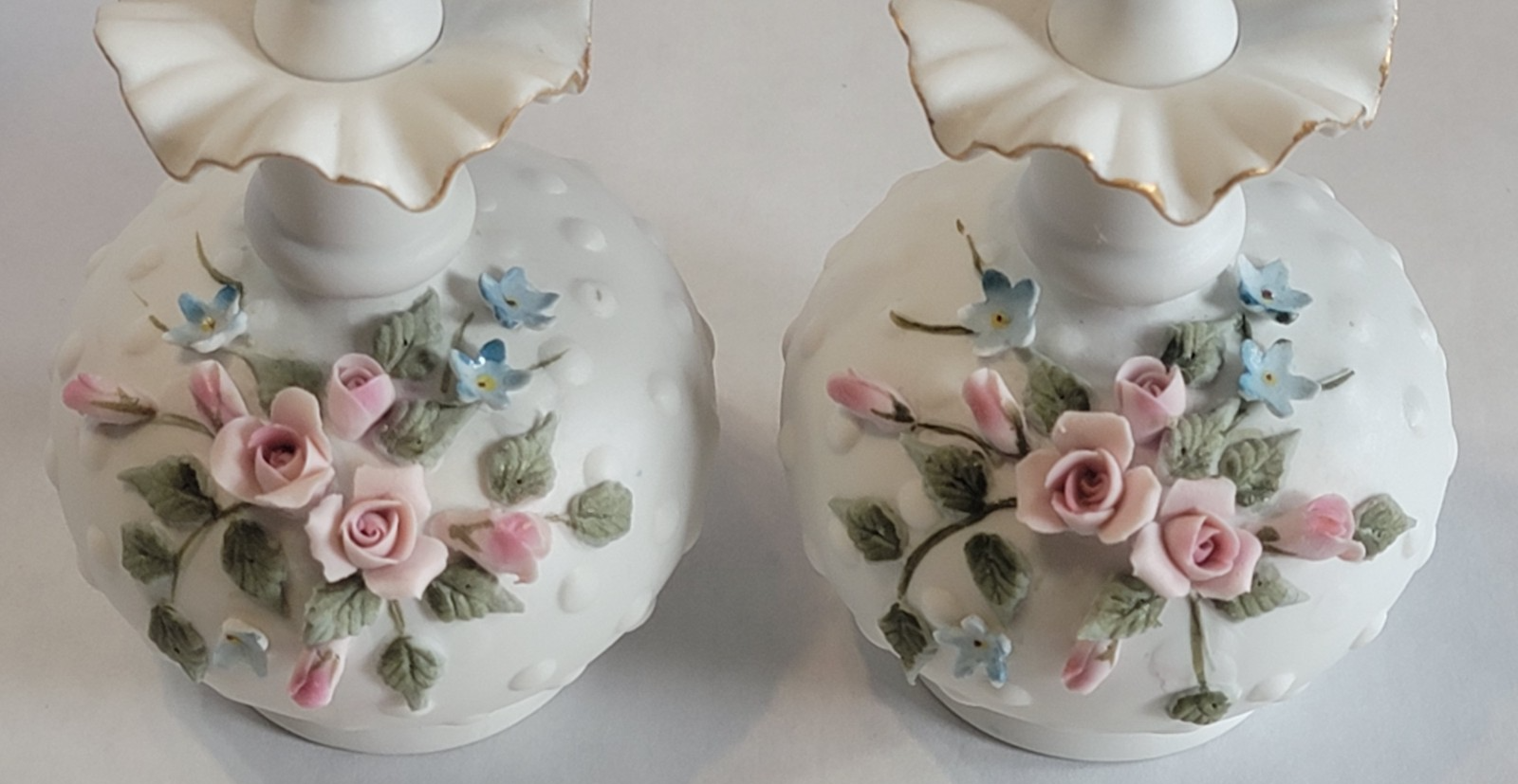 PAIR of Lefton Porcelain Decanter Perfume Bottles with Pink Rose & Blue Violet Decor with Gold Gilt Trim Toppers Minor imperfection with a flower petal broken. See photos. See photos for details and condition. Thank you for looking!