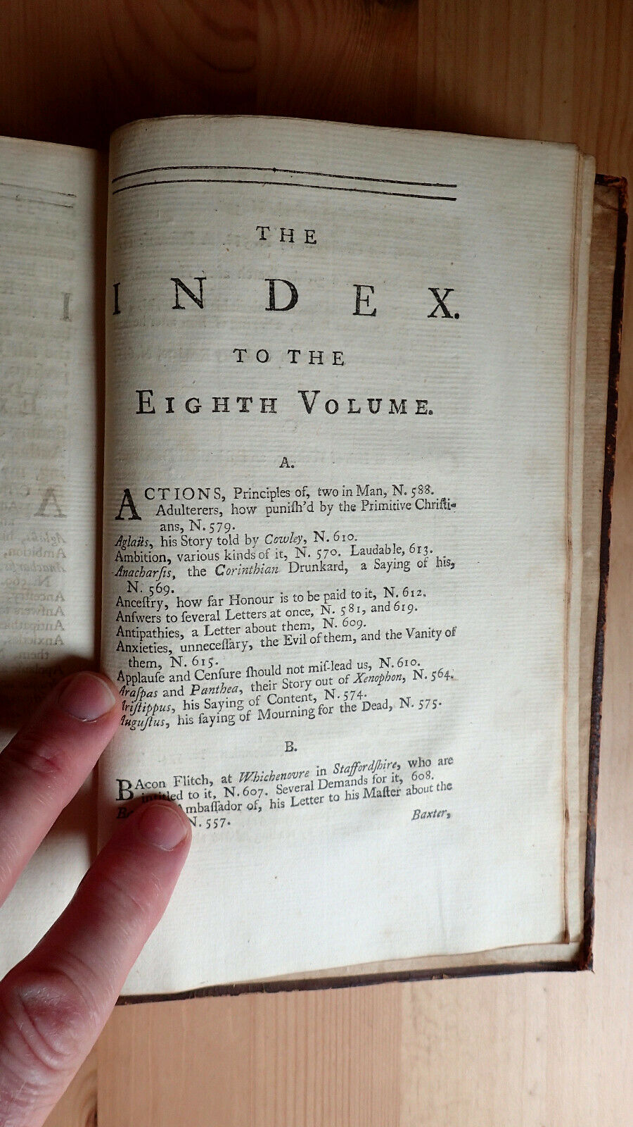 Up for auction is a volume of The Spectator Volume The Eighth And Last London Printed for J. And R. Tonson and S. Draper 1747. This is Vol 8 only of a larger 8 vol set. This volume is unique in that it contains the bookplate of Lieutenant Colonel Cooper 2nd Somerset Militia. I was not able to find much on Lt. Cooper although I believe the Somerset Militia is an English Regiment with a long and illustrious history. Condition overall good: Bound in full leather expect scuffing to leather spine is dry. Internally age toning, light foxing still bound tightly. Contains dedication, and 429 pp. plus index. As always any questions feel free to ask. The Spectator was a daily publication founded by Joseph Addison and Richard Steele in England, lasting from 1711 to 1712. Each "paper", or "number", was approximately 2,500 words long, and the original run consisted of 555 numbers, beginning on 1 March 1711.[1] These were collected into seven volumes. The paper was revived without the involvement of Steele in 1714, appearing thrice weekly for six months, and these papers when collected formed the eighth volume. Eustace Budgell, a cousin of Addison's, and the poet John Hughes also contributed to the publication.