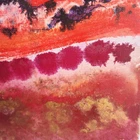 This contemporary watercolor painting is quite large, measuring 40"x30"x2." The painting is stretched around the sides and therefore does not need to be framed. This painting is unsigned, and the artist is unknown. The imagery is that of a landscape filled with trees in a rainbow of bright colors. Wavey lines represent changes in elevation both in the foreground and behind the trees. Touches of gold have been strategically placed throughout the picture to add highlights. This modern piece can cover a large wall and offer a burst of color; perfect for breaking up the monotony of an otherwise bare wall.