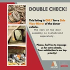 Passenger Side View Mirror Power Non-heated Fits 18-19 CAMRY 4719976 This part is from a 2018 CAMRY with 91000 miles on it. This part has been fully tested while installed and will go through our industry leading quality control inspection before shipping. This part is backed by our 90 Day Money Back Guarantee at no additional charge. If you have any questions about this part, or any other parts from this vehicle, please click HERE to send us a message. Please include the Item ID in your message so we know which part you are asking about. We answer all questions promptly during regular business hours. Part Notes Notes: 000 PAINT CODE 218 BLK 4DR Donor Vehicle Model: CAMRY Year: 2018 Mileage: 91000 (1000 = Unknown) Stock Number: 409397 SEE MORE CAMRY PARTS SEE ALL PARTS FROM THIS CAR Part Fitment Information This part will fit these makes and models with these options. CAMRY 18-19 (power), w/o blind spot alert; non-heated, Murakami, R. CAMRY 20-23 (power), w/o blind spot alert; w/o heated; Murakami, R. If you do not see your vehicle in this list, please click HERE to send us a message so before buying so we can verify if it will fit your vehicle. Our Promise Our Promise is that you are completely satisfied with every part you buy from Midway Auto Parts This part is covered by our 90 Day Money Back Guarantee . If you have a problem with the part, changed your mind or the part does not fit, simply let us know. You have 90 Days from the purchase date to return it for a full refund. Please use the eBay return center for all returns. If you need help with returning an item, simply send us a message. We are here to help. About Midway Auto Parts Midway Auto Parts is a proud member of Team PRP. Team PRP is the largest group of independent automotive recyclers in North America. Each Team PRP member uses an identical quality assurance program based on ISO 9000 standards. The result is a nationwide label that delivers consistently high quality parts and maximizes consumer, mechanical repairer, collision center, and estimator confidence. If you need a part that we do not have in stock, we can find it from our network of some of the best recyclers in the country. Shipping Information All orders placed after 1pm EST will begin being processed by the next business day. Please refer to our current handling time under the Shipping, Returns and Payments section on the listing for when the item will be shipped out. Our facility is closed on weekends and holidays. This part will ship via UPS or FedEx with live tracking information. You will receive a message with tracking information as soon as your part ships. Once shipped, please allow up to 6 business days for your part to arrive, depending on your location.