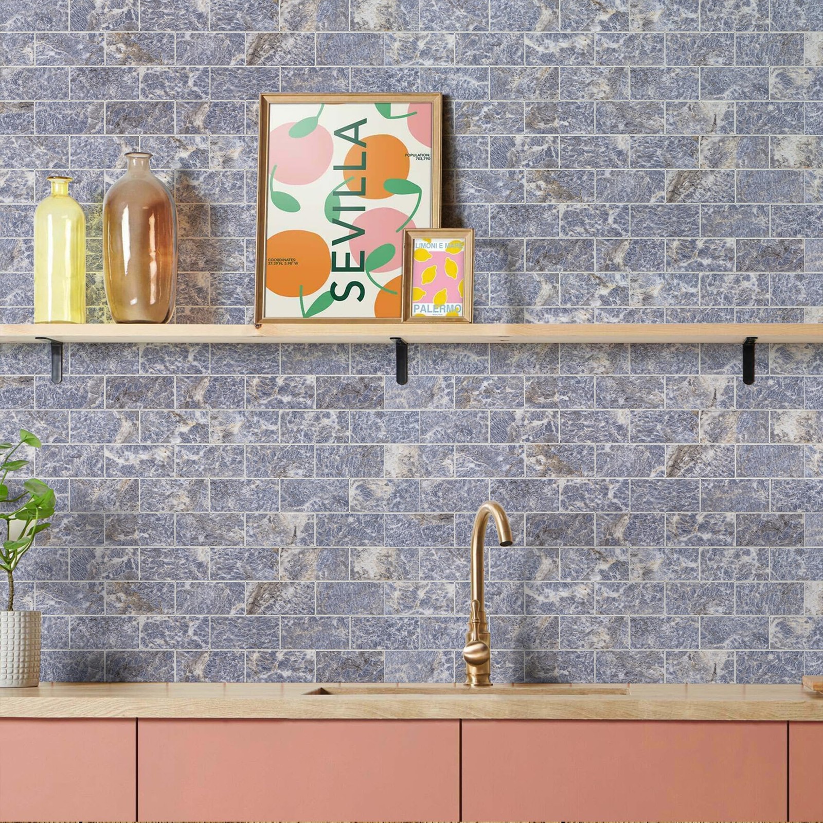 20-Sheet kitchen backsplash Wall Tile Peel and Stick, Subway Adhesive PVC Mosaic Tiles Decorative Backsplash Tiles stick on Bathroom, Fireplace, RV, Marble Blue High-End Quality: 20-sheet self adhesive subway tiles, 13.42"x 5.66"x 0.12" each, cover about 10.4 square feet. Heavy duty 3mm thick peel and stick backsplash tiles are thicker and stronger than most similar tiles on the market, making them not easy to break. Made from high-quality PVC material, our backsplash tiles are meticulously crafted with precision edges, resulting in a seamless and elegant appearance. Easy Installation: No glue, grout or extra tool is needed. peel and stick backsplash subway tiles are designed with a half-sheet design, making installation hassle-free and saving you time and effort. No glue, grout or extra tool is needed. DIY-friendly self-adhesive tile sticker is easy to install and easy to cut with a utility knife or cutting machine. No longer postpone your plan about refreshing your wall decor for high cost of labor. Versatile Backsplash Tile: Peel and stick tile backsplash with surface coating (3mm in thickness), resistant to heat, moisture and scratch, can fill the gaps between the countertops and cabinets in the kitchen and bathroom, to protect your wall from water and stains. Besides, Simple designed self adhesive wall tile is also suitable for decorating all possible surfaces in living room and bedroom, such as fireplace surface, TV backdrop, bed backdrop, RV, vanity etc. Easy Care & Durable: Our peel and stick tile backsplash has a clean and smooth surface. Easy to wipe the water, dust and stains on the surface with a damp cloth. With strong stickiness, our tiles are durable, so no worry for peeling off or deformation. No color fading. Resistant to scratch & shock. More than 10 years of service life. Notice: please make sure that the installation surface is dry and clean to maintain the good adhesion of the wall tile to the wall. After-Sales Service: peel and stick backsplash tiles are built to last with an assurance of both quality and customer satisfaction. If you have any question, please feel free to contact us. Your 100% satisfaction is out 1# priority. We also recommend purchasing an extra 3%-5% of tiles to accommodate for cutting and pattern needs.