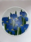 This beautiful round plate/tray by Peggy Karr features a stunning blue flower iris design, handmade with high-quality fused glass materials. The plate has a diameter of 13.5 inches and is perfect for serving your favorite dishes. The contemporary style and multi-color pattern make it a great addition to any collection. This plate is signed by the artist and is a one-of-a-kind piece. It's perfect for those who appreciate unique, handmade items. Add this beautiful iris platter to your decorative cookware, dinnerware, and serveware collection today! kk383