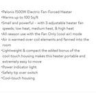 Pelonis Electric Fan-Forced Space Heater Adjustable Thermostat 1500W White NEW. Please view images and item specifics for additional information. For more information on our payment, shipping or return policies, visit our storefront ABOUT US page. Thank you