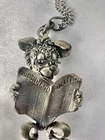 This vintage necklace features an adorable pewter poodle reading a newspaper. The pendant hangs from a delicate chain and is a perfect accessory for any dog lover. The piece has a distinctive style and can be worn on any occasion. The brand of the necklace is unbranded and it falls under the category of jewelry and watches. The necklace is pre-owned but remains in excellent condition. It is a unique and eye-catching piece that will undoubtedly attract attention. The pendant is perfect for those who appreciate vintage and antique jewelry, and it will make an excellent addition to any collection. A42
