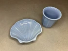 The Pfaltzgraff Stoneware Sky Blue Shell Soap Dish and Tumbler bathroom set of 2 is a charming vintage/retro accessory set perfect for adults. Made of ceramic in a solid sky blue color, this set includes a round shell-shaped soap dish and a tumbler. The set is original and was manufactured in the United States, making it a unique and stylish addition to any bathroom decor. Please inspect photos carefully