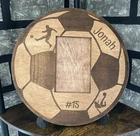 Elevate your home decor with this personalized soccer wood picture frame, a thoughtful and unique piece that celebrates your love for the game. Crafted from premium wood, this frame boasts a stunning circular design with intricate soccer-inspired engravings that add depth and character. The frame can be displayed vertically, holding a cherished 4x6 inch photo, or mounted on the wall as a striking accent piece. Measuring approximately 11.5 inches in diameter, this frame strikes the perfect balance between size and elegance. Whether you're commemorating a special sports moment or showcasing your team spirit, this personalized frame is a must-have for any soccer enthusiast's collection. Personalized name and jersey number. It has an acrylic plate to protect the photograph while in the frame. The acrylic plate and picture are inserted in the back of the frame through a slot on the right-hand side of the frame. Thoughtful Gift: With its personalized touch and timeless appeal, this picture frame makes an ideal present for baseball fans, sports enthusiasts, or anyone who appreciates handmade artistry. Versatile Display: The frame can be displayed vertically on a stand or mounted on the wall, allowing you to showcase your favorite 4x6-inch photo. Dimensions: The frame measures approximately 11.5 inches in diameter and is designed to hold one 4x6-inch photo in a vertical orientation. Ordering Instructions: Please note the name and jersey number you would like engraved onto the picture frame.