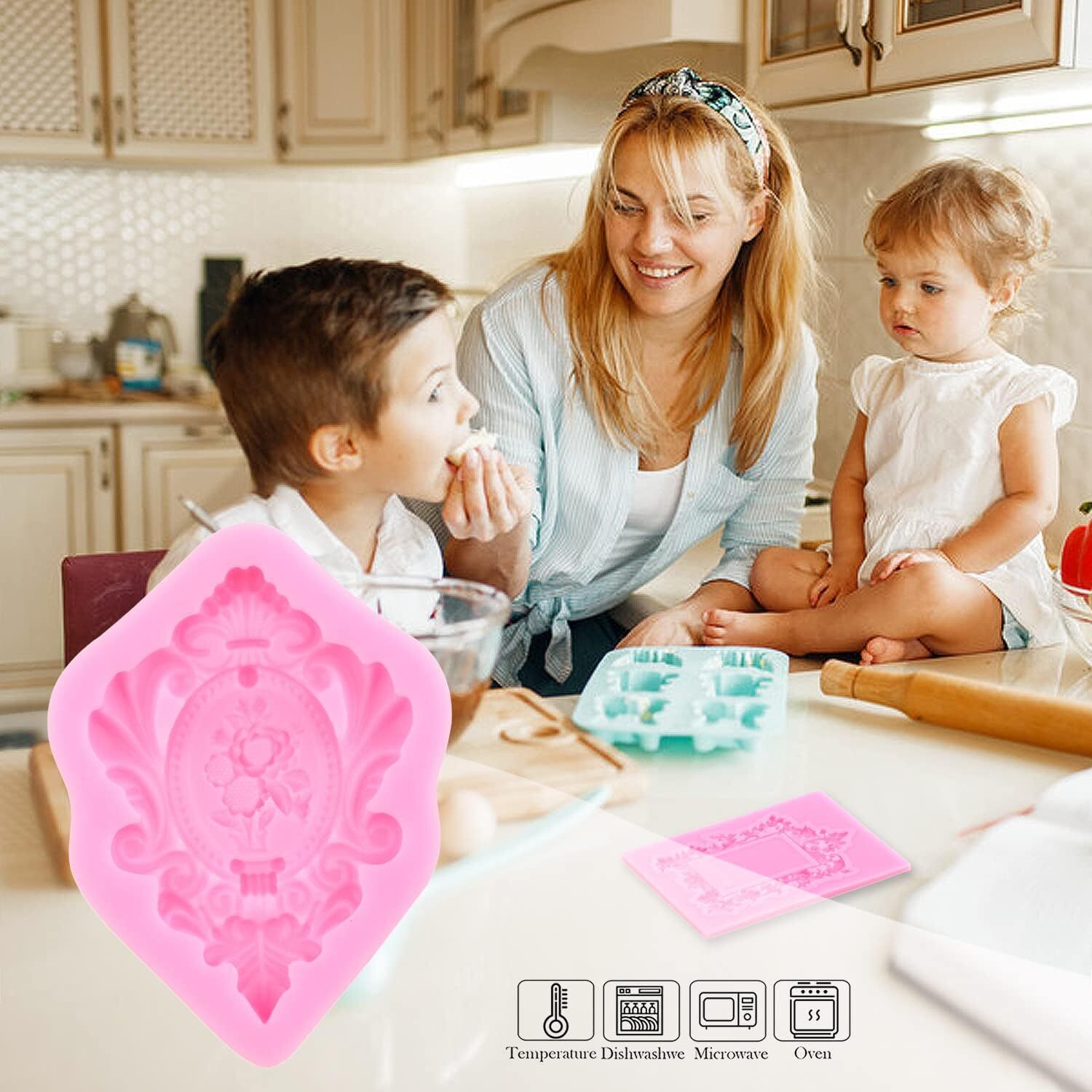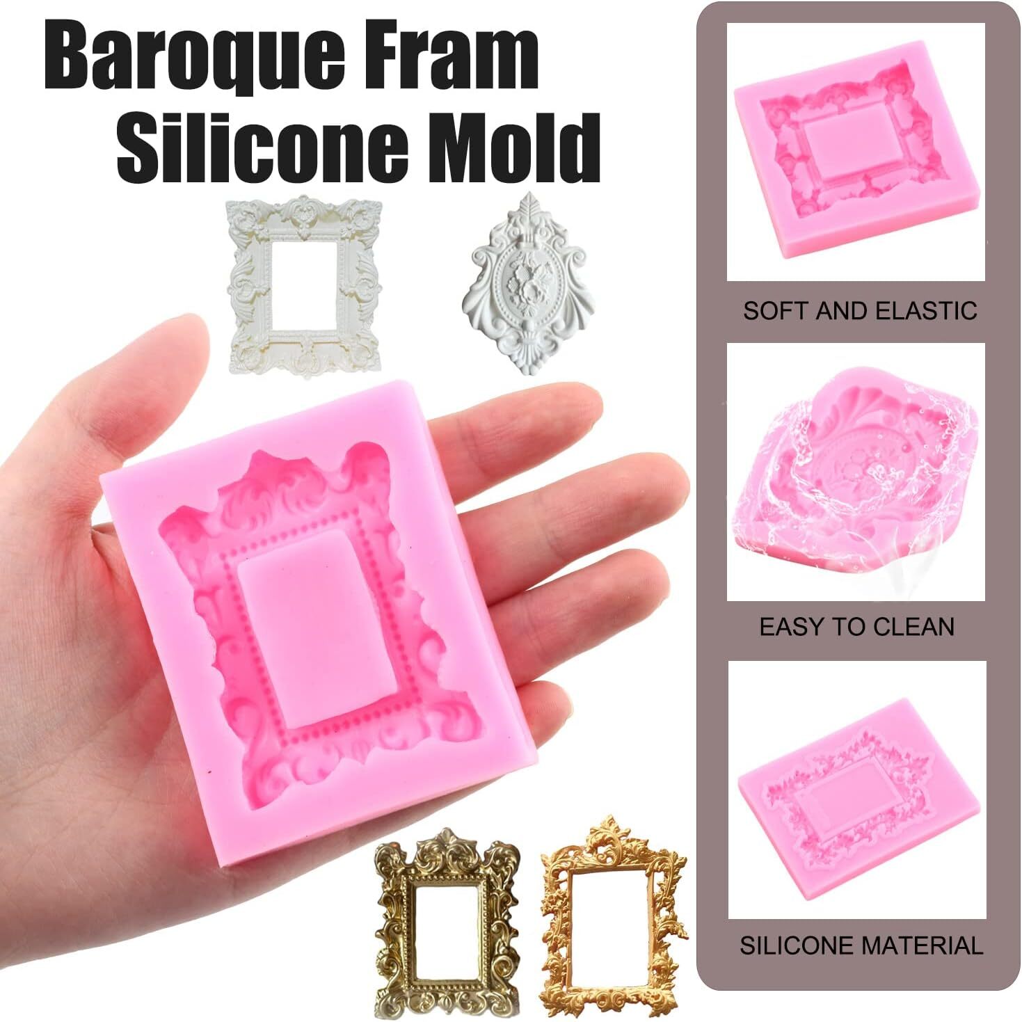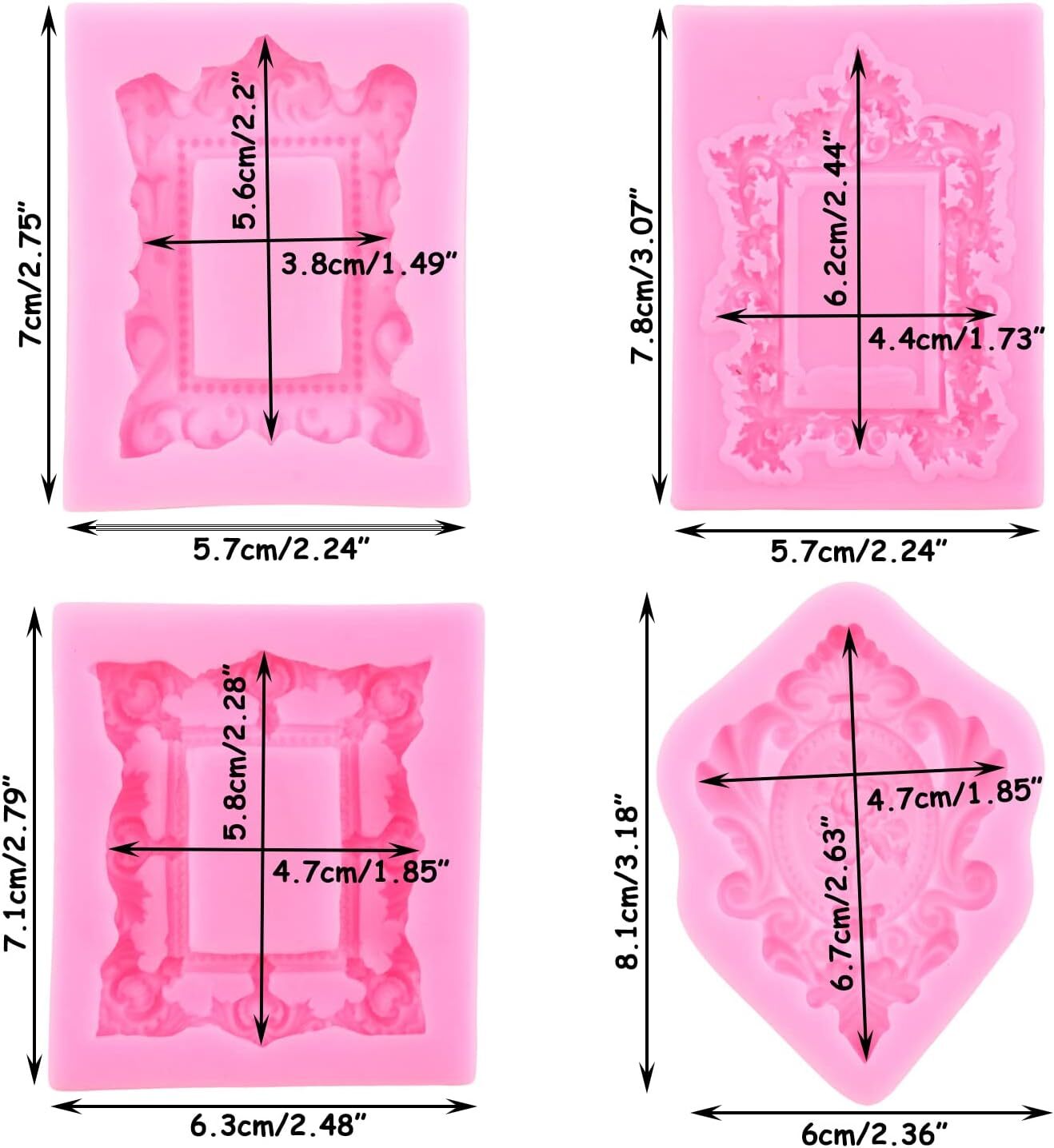 Picture Frames Silicone Mold Photo Frame Fondant Baroque Vintage Pink Product Details Brand: LKDQUTHM Color: Pink Material: Silicone Item dimensions L x W x H: 3.18 x 2.87 x 0.39 inches Number of Pieces: 4 【Picture Frames Silicone Mold】: Picture Frames Silicone Fondant Mold, it's easy to create detailed shapes in exciting designs, great for making cake decorating. You will get 4 pieces Photo Frame Silicone Mold.The size of each mold is different; Please refer to the picture for the specific size. 【Variety of production methods】: The Photo Frame Fondant Mold design has fine workmanship, suitable for baby shower, christmas , wedding cake decorating or birthday party; This Frames Fondant Mold with different Picture Frames Photo Frame Vintage Frame Mirror Frame shape will be nice for adding beautifully detailed decorations for your crafts and cake projects. 【Exquisite Party Gifts】: Mirror Frame Mold, you can play with family and friends, make fondant, chocolate, candy or decorate cakes, and get clumping skills;Vintage Frame Fondant Mold is a good gift for friends and family. 【Material is safer】: Picture Frames Fondant Mold Made of 100% food grade silicone, Mirror Frame Fondant Mold are soft and made of non-stick design, release easily after gently twist, Picture Frames Candy Mold shapes popped out so easy, also it is easy to wash. This Photo Frame Candy Mold can be used safely in ovens, microwaves, and freezers.Vintage Frame Candy Mold heat-resistant temperature range is -40 to 220 degrees Celsius/-40 to 445F. Product DescriptionTop Quality MaterialPicture Frames Cake Decorating Mold, made with top quality food grade silicone material.which is easy to demold and clean, also more durable to it can tolerate high temperature range from -40℃ to 230℃.Size:4 pcs different Photo Frame Fondant Silicone Molds1Pcs Photo Frame Fondant Molds:2.24*2.75inch1Pcs Picture Frames Fondant Molds:2.24*3.07inch1Pcs Vintage Frame Fondant Molds:2.48*2.79inch1Pcs Mirror Frame Fondant Molds:2.36*3.18inchPhoto Frame Cake Topper Decoration MoldsPicture Frames Candy Silicone Molds Prefect for Cake Decoration, Fondant, Chocolate, Cookies, Muffin Cupcake, Candy, Gum Paste , Pudding, Resin Clay MoldsNOTES1. Vintage Frame Chocolate Molds before first using, please wash with water to remove surface dust.2. Don't use on open flames or over a direct heat source.3. Don't pull and impact it violently or scratch it with sharp things.4. In order to avoid the dust, don't directly exposure it to the air for a long time.5. When baking, it' s better to put the mold in the flat baking tray as the silicone mold is soft.About LKDQUTHMWe working for silicone molds and other home kitchen supplements for many are striving to make high quality products and provide sincere service to every our customers.