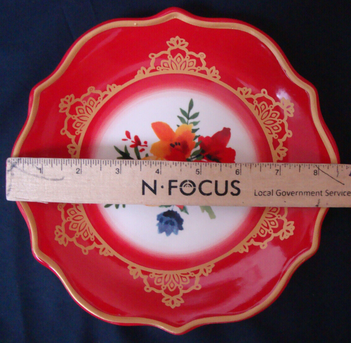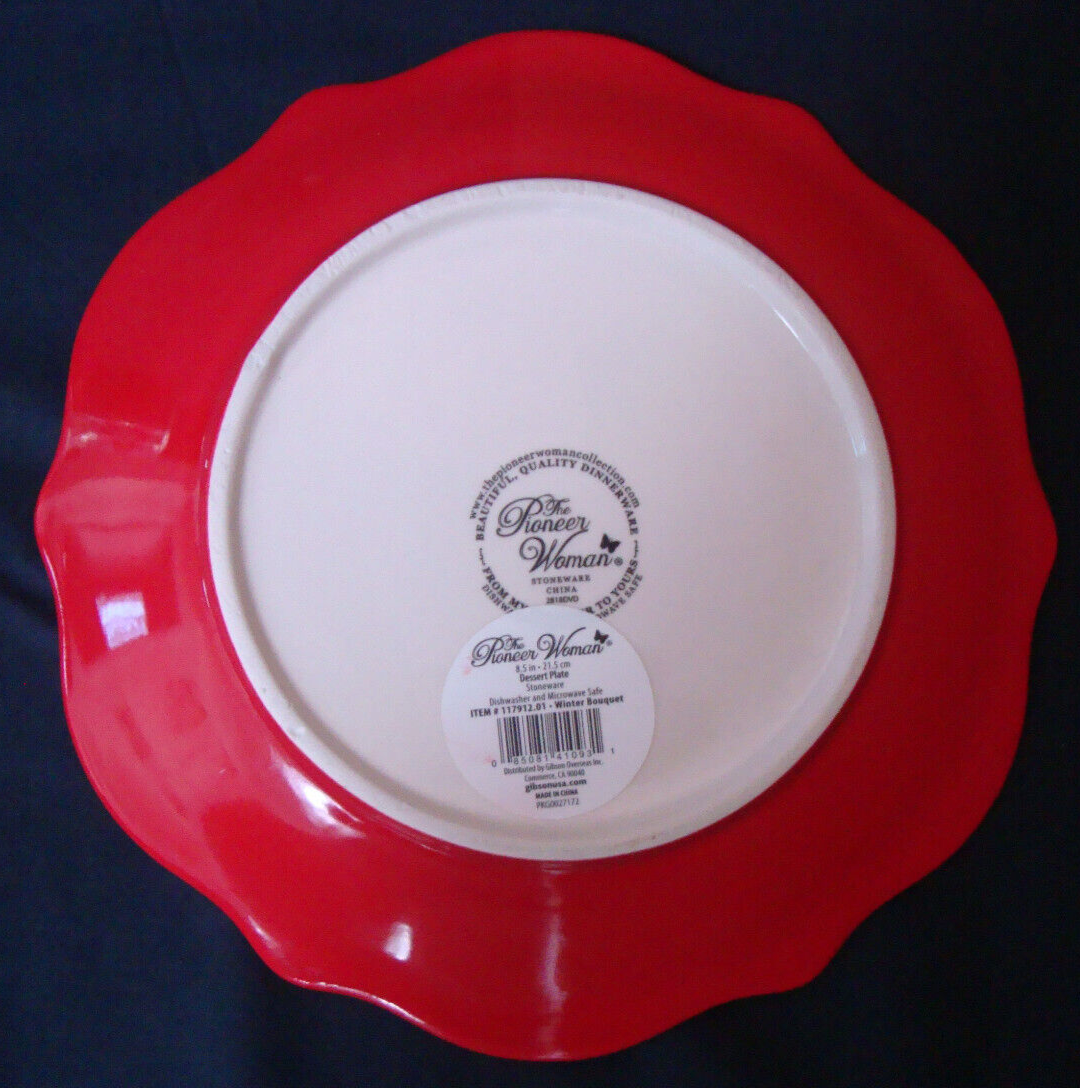 Pioneer Woman Dessert Plate Winter Bouquet 8.5” Red Gold Trim CONDITION: Wear in one small spot on gold trim as shown in photo. Small nick to bottom foot as shown in photo.