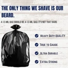 Offering a full 55 to 60 gallon capacity, these extra-strong black trash bags are heavy duty in warehouses or assisting with big outdoor projects. With a generous maximum load of 100 lbs. and a flexible, reinforced gusset seam, you can fill them up with confidence, knowing they won't split under pressure. Manufactured in the USA from a full 1.5 mil thickness of superior low-density resin, you'll find that these bags offer amazing resistance to punctures, even when dealing with rough, sharp trash. If you need an extra-large, resilient, opaque black garbage bag, this case of 50 provides excellent value. Dimensions: 22" x 58" Offering a full 55 to 60 gallon capacity, these extra-strong black trash bags can often be found doing heavy duty in warehouses or assisting with big outdoor projects. With a generous maximum load of 100 lbs and a flexible, reinforced gusset seam, you can fill them up with confidence, knowing they won't split under pressure. Manufactured in the USA from a full 1.5 mil thickness of superior low-density resin, you'll find that these bags offer amazing resistance to punctures, even when dealing with rough, sharp trash. If you need an extra-large, resilient, opaque black garbage bag, this case of 100 provides excellent value. 100/case Black Flat-packed, for easy storage Low-density plastic (thicker material) for puncture resistance Extra heavy thickness (1.5 mil) for exceptional strength Ideal for sharp, pointed objects and solid material Gusset seal disperses waste throughout Dimensions: 36�W x 58�H Bag load capacity: 60 lbs. Bag volume capacity: 189-208 liters 90% recycled material