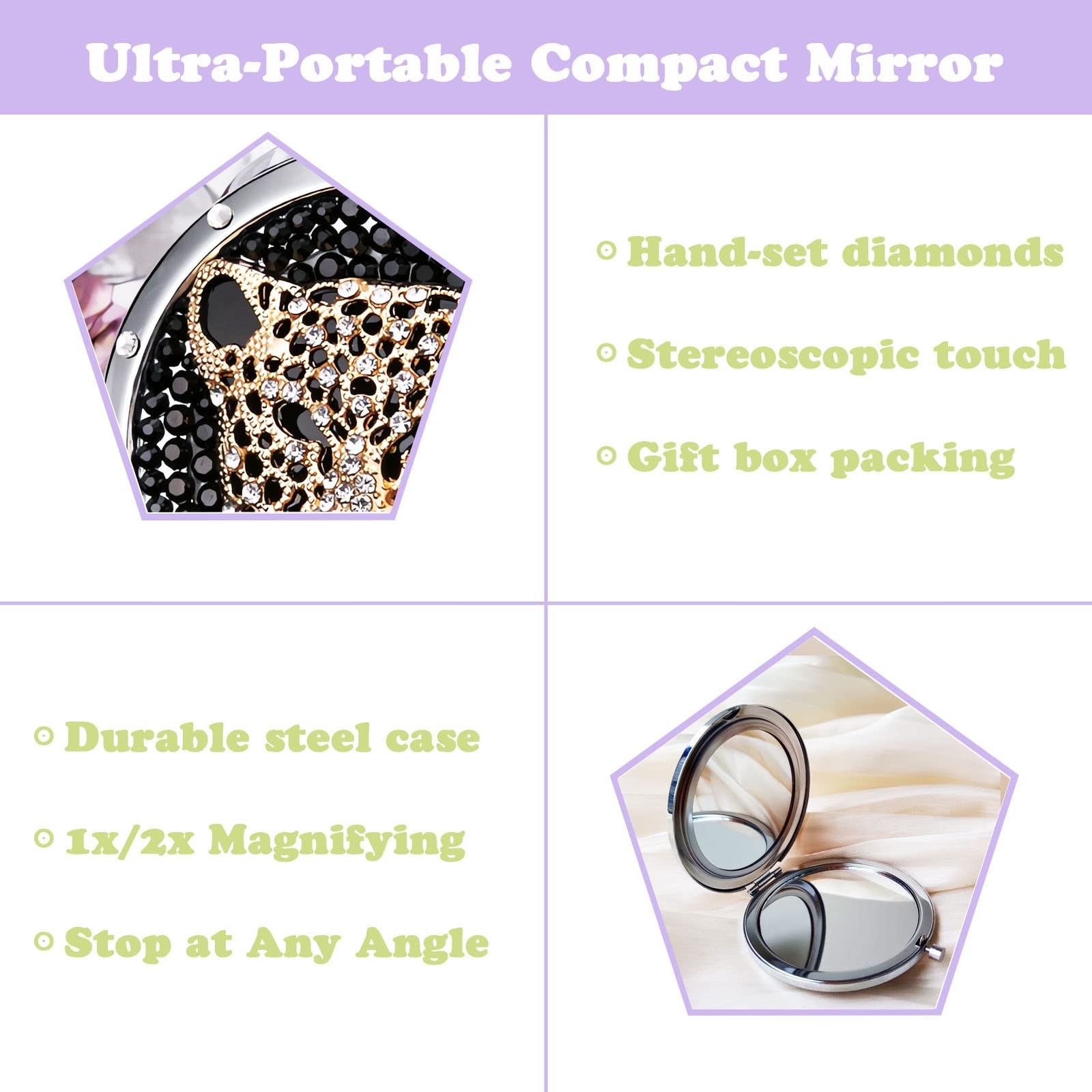 Portable Mirror Travel Mirror with Rhinestone Leopard 2-Sided Magnification Compact Mirrors with Gift Box (Leopard) Product Details Color: Leopard Brand: Amanman MPN: Does not apply UPC: Does not apply EAN: Does not apply Brand: Amanman Shape: Round Product Dimensions: 3"L x 2.75"W Frame Material: Stainless Steel Mounting Type: Tabletop Mount Brand: Amanman Shape: Round Product Dimensions: 3"L x 2.75"W Frame Material: Stainless Steel Mounting Type: Tabletop Mount Special Feature: Portable, Magnifying Color: Leopard Theme: Travel Specific Uses For Product: Makeup, Personal Grooming Number of Pieces: 1 Number of Items: 1 Material: Stainless Steel Frame Type: Framed Assembly Required: No Manufacturer: Amanman Size: 3"L x 2.8"W Item Weight: 3.52 ounces Date First Available: March 9, 2023 Exquisite BUT Durable When you are interested in the design of this compact mirror, your biggest concern must be whether these exquisite diamond and pearl ornaments are easy to fall off? We would like to tell you that they are very strong, each diamond and pearl is professionally inlaid and can be used for years without falling off. Portable Mirror Size The small round mirror is 3*2.75inch,perfect size as travel mirror to fit into handbag or pocket. 1x/2x Magnification 1x plane high-definition mirror on upper part reflects a clear image of the entire face, and the 2x magnifying glass can help you see the details when you draw eyeliner, wear contact lenses, squeeze acne, check your teeth, etc. Stop at Any Angle Hands-free experience! The hinge of the makeup mirror allows to be extended and stop to any angle within 180 degrees to provide your a comfortable direction, so that you can do your makeup with both hands. Gift Box Package Each compact mirror packed in a gift box, it's a good choice for daily use and gift giving to family and friends on holiday, birthday, anniversary... Item: Amanman compact mirror portable mirror.Travel Mirror Material: Steel shell, alloy decoration, glass mirror.Small Mirror Size: Small round mirror=32.75inch, square pocket mirror=2.62.3inch.Magnification Makeup Mirror: Handheld mirror with 1x/2x magnification.Gift Box Package: Each compact mirror packed in black or pink gift box for daily use or gift giving.