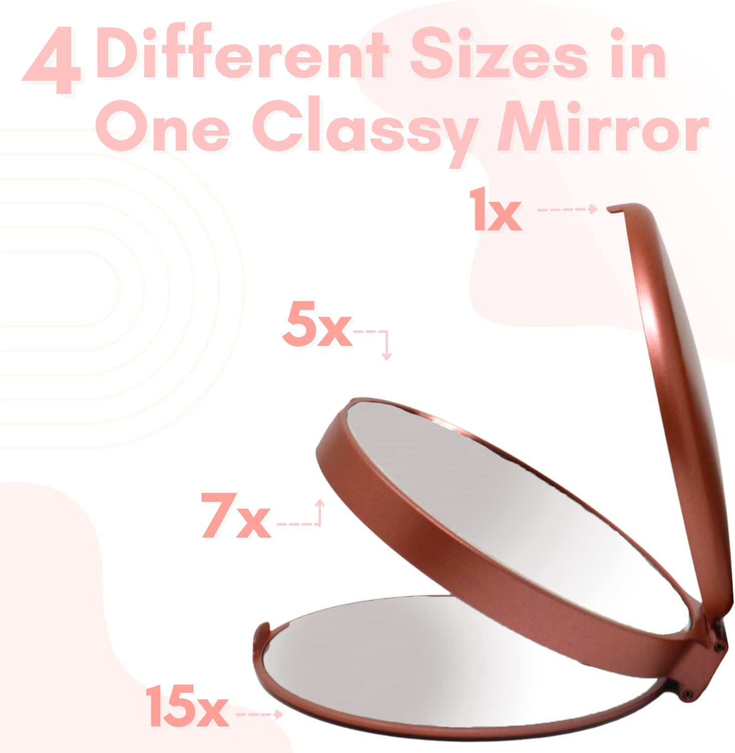 Magnifying Makeup Mirror 4 in 1 Portable Blush Pink Handheld Cosmetic Description THE BEST TRAVEL MIRROR - For the car, makeup bag, Office, and Bathroom for any quick touch-ups. Along with getting ready for a girl's night, date night, or a big life event. LOOK AT YOURSELF IN THE BEST LIGHT - This magnifying mirror will help you see stubborn hairs, blemishes, or imperfections in order to remove and cover up any flaws. Its stylish exterior makes it a perfect tool to take with you for both casual and classy occasions. COMPACT FRAME FOR EASY STORAGE - This 4-1/2 inch diameter product folds out into 4 mirrors with different magnifying faces. Each face is designed to give you a unique perspective giving you the ability to look your best in any setting. The mirror's compact frame can easily fit on your bathroom counter, in your purse, or in a drawer. FOUR DIFFERENT PERSPECTIVES - With Doll of Mirrors you get 4 different magnifications (1x, 5x, 7x, 15x) in one classy compact makeup mirror compared to just having 1 or 2 different zoom options like with other brands. Its unique size makes it easy to take with you for your everyday beauty needs. THIS HANDHELD MIRROR - Is a great way to get up close to apply makeup, remove hairs, manage stubborn pimples, or for makeup removal after a long day. Perfect for touchups and tweezing those little facial hairs that can drive you crazy. Product Description Shipping and Return policies We offer a 30-day return/exchange policy for our products. You can choose a refund or exchange if you are dissatisfied for any reason with your product. All items ship from a US-based warehouse Shipping is always FREE. If you have any issues or you unsatisfied with your order, don't hesitate to get in touch with us before opening a case or leaving negative feedback. We promise to give you a solution ASAP. ♥Kindly note:♥: If you would like to order more quantity than shown is available, you are welcome to place one order for the maximum, and Place the order again because we always have more than shown in available items. Magnifying Makeup Mirror 4 in 1 Portable Blush Pink Handheld Cosmetic