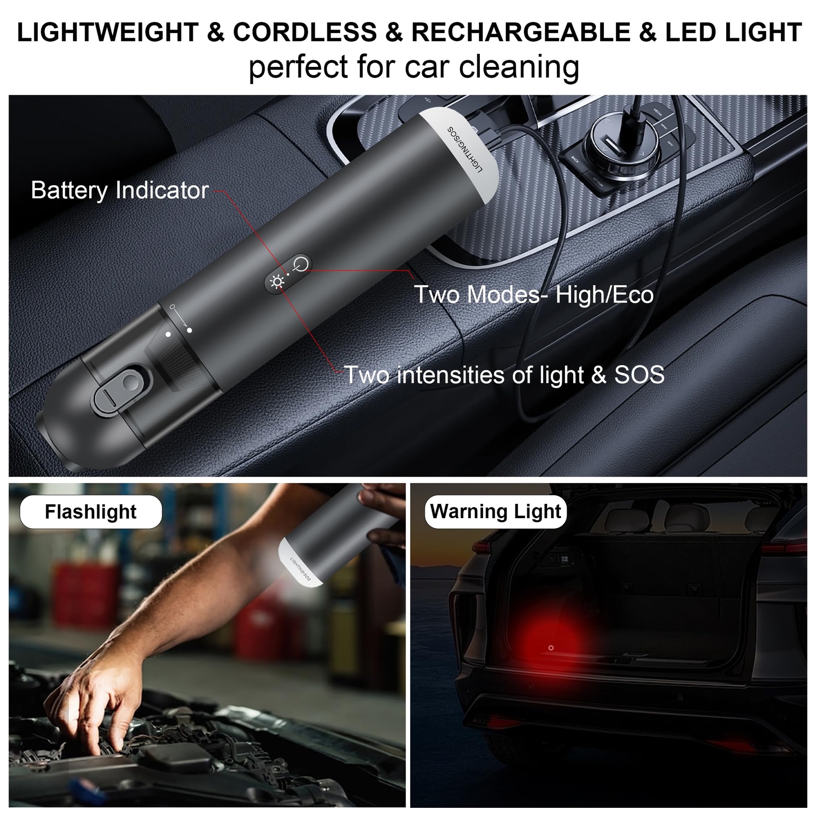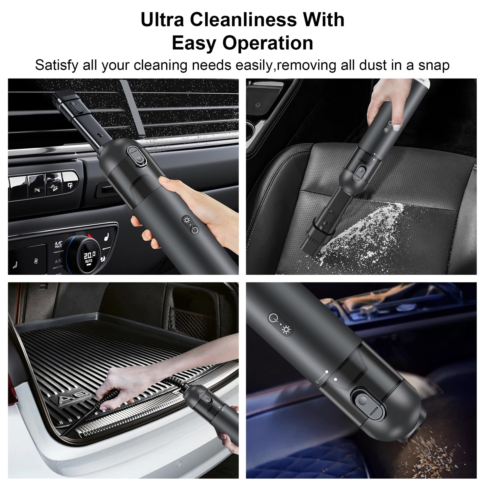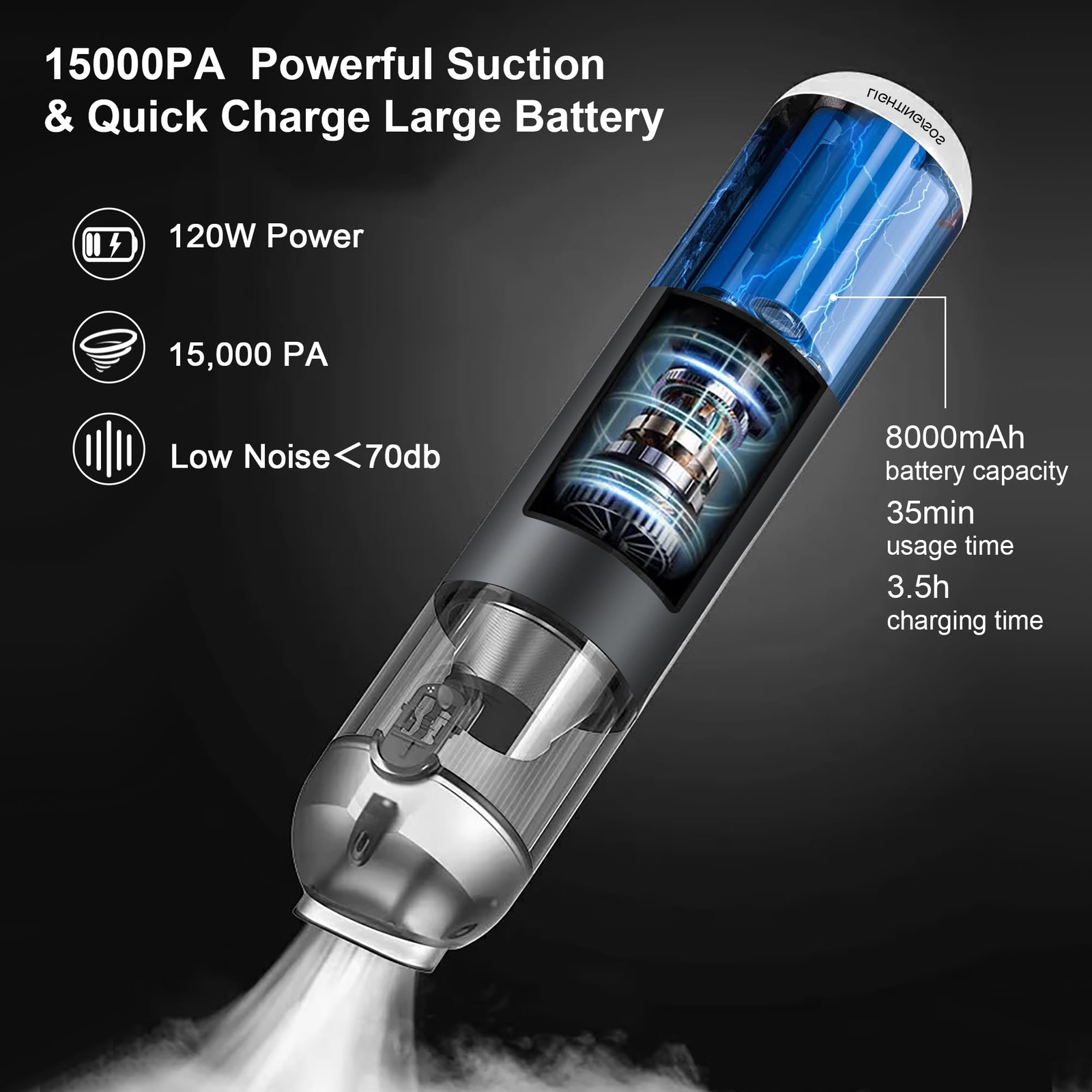 The Portable Wireless Handheld Car Vacuum Cleaner with Strong Suction is the perfect tool for keeping your car's interior clean and pristine. With a powerful motor that provides strong suction, this vacuum cleaner makes it easy to clean up dirt, debris, and crumbs in just minutes. Its wireless design allows you to take it with you wherever you need it, without being tethered to a power cord or outlet.The texture surface of the vacuum ensures comfortable grip and easy maneuverability, while the removable and washable HEPA filter makes it easy to clean and maintain. The vacuum cleaner comes with multiple attachments and accessories, including a crevice tool, dusting brush, and extension hose, so you can tackle any cleaning job with ease. Whether you're looking to keep your car looking its best or just need a convenient and efficient way to clean up messes on the go, the Portable Wireless Handheld Car Vacuum Cleaner with Strong Suction is the perfect choice. [15000PA Powerful Vacuum Cordless] This car vacuums with best suction cordless features an 120W upgraded powerful motor with much less noise lower than 70dB, speed up to 90,000RPM. suction modes can be switched freely: 15kPa/10kPa, this handheld vacuum cordless allows you to clean pet hair, crumbs, dust, and sand in car seat or sofa. [Long-lasting Battery Life & Type C Charging] This mini vacuum cleaner cordless adopts 8000 mAh battery, can be fully charged in 3.5 hours, which can provide up to 35 minutes of continuous use on a single charge, which is enough to clean the corner of home, car, kitchen or office. [6-in-1 Design Portable Vacuum Cordless] Combines the car vacuum cleaner, inflator, led flashlight and SOS light in design. This versatile vacuum handheld is a must-have for keeping your vehicle clean and fresh at all times, ideal for car detailing, home cleaning and outdoor use. [Multi-Purpose Accessories] This cordless vacuum cleaner for car comes with a variety of nozzles, extension hoses easily to clean hard-to-reach narrow gaps and corner. The 2-in-1 brush nozzle is suitable for cleaning car air outlets, stubborn dust on foot pads. Equipped with 4 universal nozzles, it is suitable for inflating balloons, swimming rings, and so on. [Lightweight and Portable] Say goodbye to tangled cords and limited reach with this hand vacuum cordless rechargeable. Its lightweight construction allows effortless maneuverability around the house and car, making cleaning a breeze. Reusable HEPA filter is washable and air-dried. Efficient cleaning leads to an elegant life.