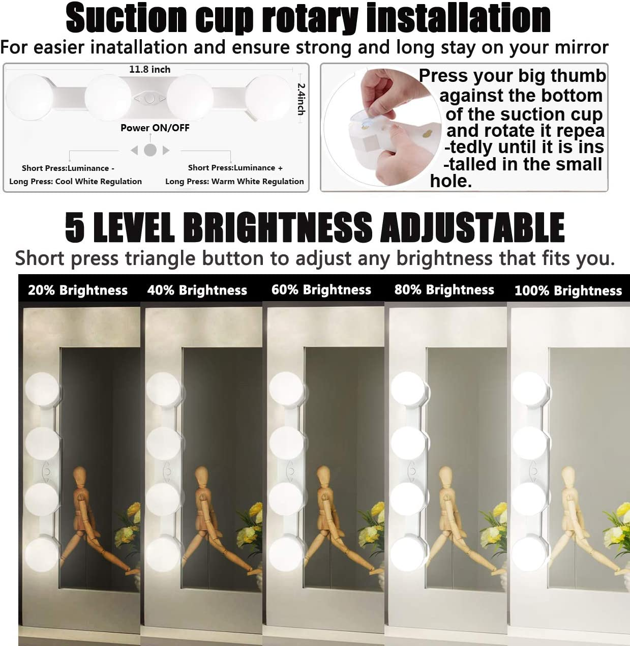 Rechargeable Design: Cordless design of makeup lamp easy to carry and install.Standard Usb charging, red charging,full of bright bule,can be filled in about 2-3hours. 3 Color Temperature Modes for Make-up: The vanity Lights has 3 color temperatures (warm white, natural and cool white) to provide you with soft and bright light. Meet your makeup needs under different lights. Brightness Adjustment: The Led mirror light has 5 levels of brightness to choose from, you can touch the small triangle button to select the desired brightness. Memory function means that the lights always stay at the desired brightness level when you have turned off the last time. Suction Cup Installation: Press your thumbkin against the bottom of the suction cup and rotate it repeatedly until it is installed in the small hole. Installed in seconds without tools or wiring. Multi-functional Led Lights: Which can be widely used for kitchen cupboard lights,wardrobe lamp,writing desk lights,bathroom lights,makeup dressing table lights,emergency light Lighting. Product Description 1. Do you worry about the color difference after you makeup? 2. Does the the insufficient light distress you when you makeup? 3. Are you worried how to choose the professional color temperature of the light to show the natural makeup? Assemer LED makeup light kit have Natural light, Cool light and Warm light 3 light color options,Cordless portable rechargeable,brightness color temperature adjustable makeup lights for your Make-up needs. Portable Makeup Lights Makeup Light Detail 4W total wattage 3 Color Temperature Dimmable LED Light Bulbs Rechargeable Cordless Portable Makeup light Why You Need Vanity Lights When Makeup ? If you want to have a professional makeup, in addition to make-up techniques, vanity light is essential. Light projection in the face of the light enough, will not form a shadow, on the makeup to ensure uniform color. And you can use the mirror to makeup in the dark condition. 4 dimmable Led makeup miror light Easy be installed and easily stick it directly on the mirror Cordless portable rechargeable dimmer makup light DIY a vanity mirror with low budget Why Choose Assemer Vanity Lights? Portable Makeup Light Flexibility for your make up at home, business or you want, portable to carry. Suction cup rotating installation LED vanity mirror lights kit with suction cups design,can be installed in seconds,no tools or wiring required Micro-USB Port Powered Micro-USB data cable charging (red light when charging, blue light when fully charged) Adjustable Color Temperature and Brightness With 3 kinds of color temperature and 5 levels of brightness adjustment, it can meet the needs of makeup lighting. Lights for Make-up Makeup mirror lights, It is close to the daylight brightness so your skin color be show naturally. Bathroom Vanity Mirror Lighting Touch the small triangle button to adjust the brightness of the light. Therefore, you don't have to worry about the light being too bright or too dark. The Choice for Gifts Gift for your loved ones: the gift for your loved ones during Valentines Day, Christmas, birthdays, or any other holiday.