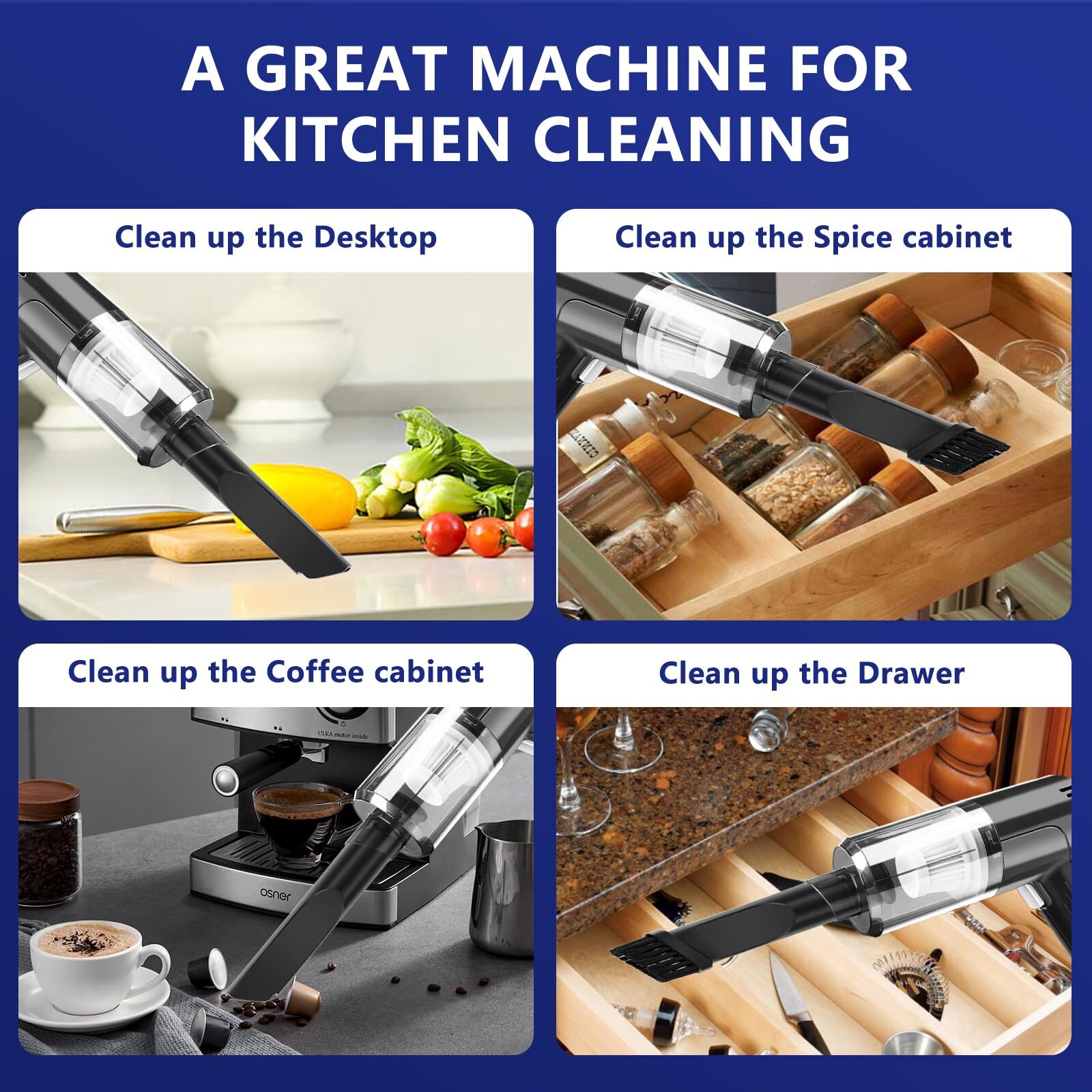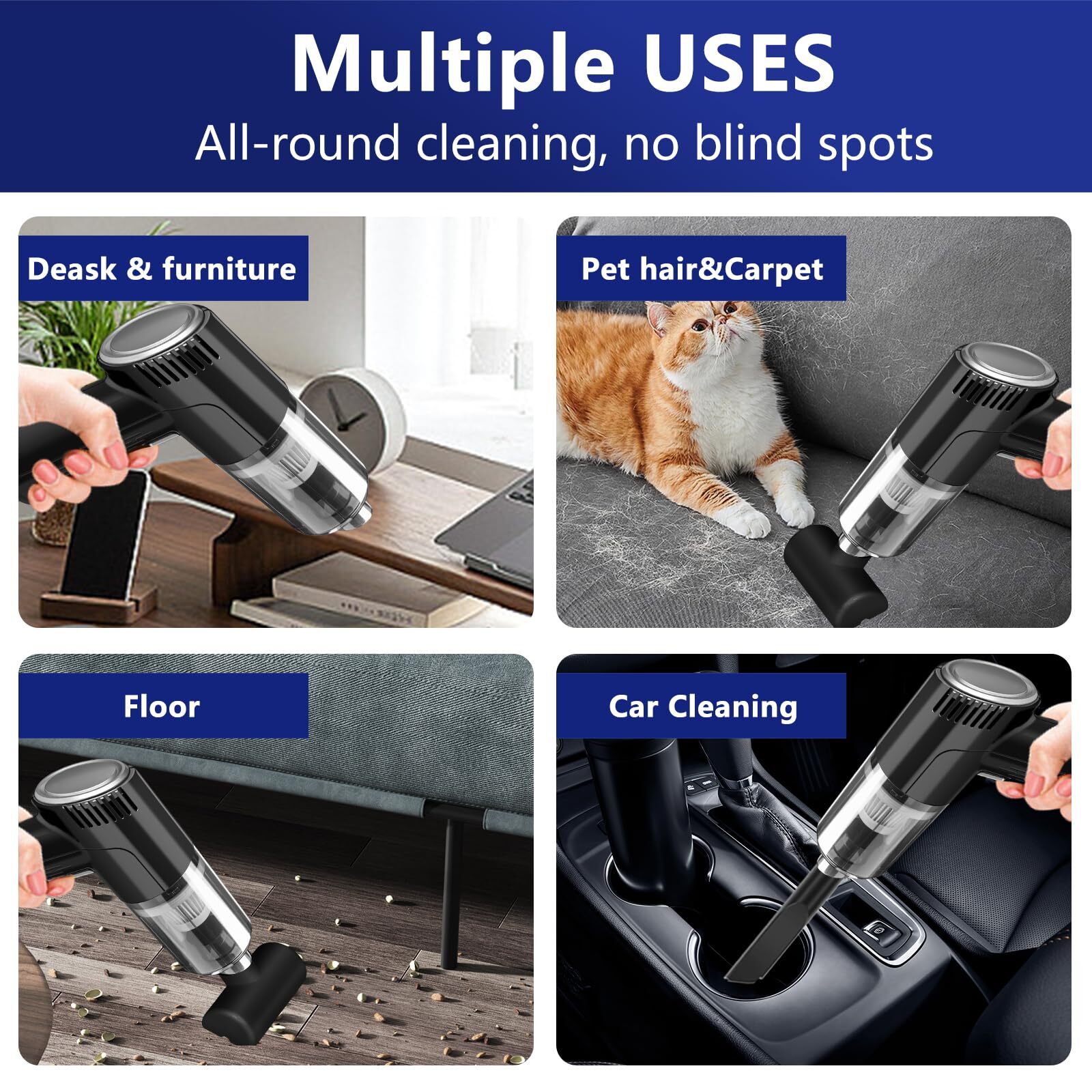 【Multifunctional Vacuum Cleaner】Portable handheld vacuum cleaners provide 1 * floor brush,1 * brush nozzle, and 1 * slit nozzle, these practical slit tools can be used to clean hard-to-reach areas. Handheld Vacuum Cleaner can be a laptop cleaner, desk vacuum cleaner, hand vacuum for car, piano, pet house, office desk cleaning, etc. 【Cordless & rechargeable】USB Rechargeable, the car vacuum car cleaner cordless has a built-in 4000mAh rechargeable lithium battery, can work continuously for 20-30 minutes, and it can be fully charged in 3-4 hours. Comes with a charging cable, which can be connected to a laptop computer, car USB port charging, mobile power supply, etc. 【Washablefilte and removable 】 Its HEPA filter is washable and reusable, which keeps dust and dirt out to avoid blockage. Take the filter out of the dust cup of the vacuum cleaner, wash it with water and dry it for second use. (Using tip: If the vacuum filter is full of dirt or suction weakness, please clean the filter in time to make sure the dust buster can work normally.) 【9Kpa Strong Suction 】The handheld car vacuum has 9Kpa Strong Suction, Suitable for daily housework to clean up the dust. Output power130W superpower motor provides strong suction up to 9000pa, which can quickly and easily remove food residues, particles, and pet hair around the house or in the car.Wet/Dry vacuum wireless mobile operation is more convenient. 【Multifunctional Vacuum Cleaner】Hand held wireless professional car vacuum cleaner, make your car and home clean every day. The handheld vacuum cleaner has a lightweight body and weighs only 0.65 KG. It is not tired to hold for a long time and is especially suitable for the elderly and women.🔴If you are not satisfied with your purchase, please us. We will reply and provide service to every customer within 24 hours