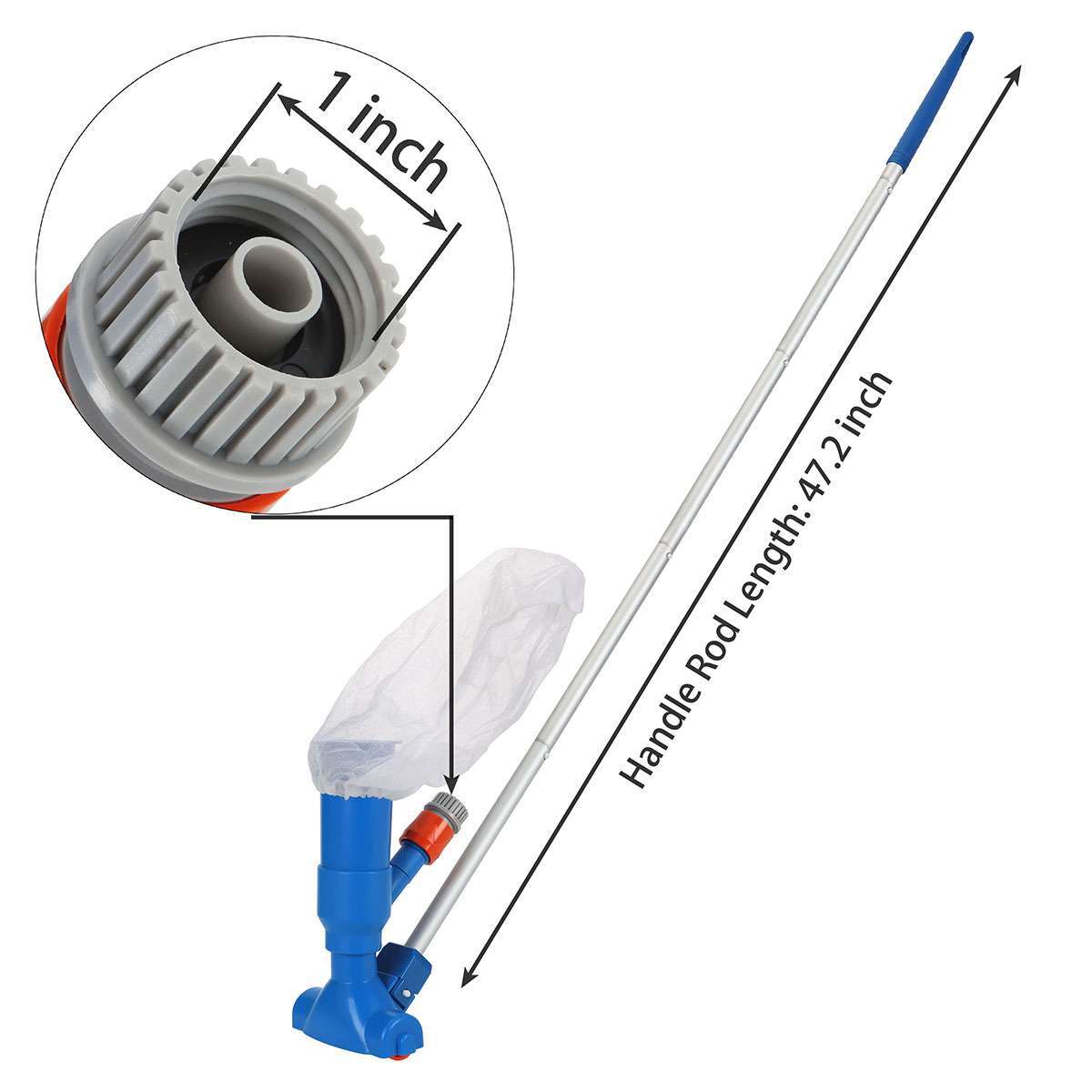 Product Description Specifications: Material: Plastic Color: Blue Handle Rod Length: 120cm / 47.2in / 3.94ft Hose Connector Female Thread Max Diameter: 26mm / 1in Features: · Detachable handheld swimming pool vacuum jet cleaner, works nicely on cleaning the small debris in the pool, like sand, silt, small leaves and so on to bring you a clean pool. · Multipurpose and portable vacuum cleaner, can also be used for removing the small debris from the spa, pond, fountain and so on. · Sucker bottom with wheels makes it handy to move around for cleaning. · Long handle provides a labor-saving operation. · Mesh filter collection bag with a drawstring cord lock allows a convenient attachment on the outlet tube. · Easy to assemble. 1. Install the handle connector on the wheeled sucker head with the white fixer stick. 2. Connect the handle parts together and then attach the complete handle to the handle connector. 3. Install the water inlet tube with an orange hose connector on the sucker head. 4. Install the outlet tube onto the forked inlet tube and attach the mesh bag to its top. · Easy to use. Simply attach the garden hose to the vacuum cleaner’s orange connector and then turn the water on. The water from the hose enters the vacuum and creates a suction effect that pulls the dirt and debris into the mesh collection bag. Place the vacuum suction head over the debris and move it to remove the debris from the floor of the pool. Notes: * Due to effect of light, camera and monitors, the item’s real color may be slightly different. * Allow slight dimension difference due to manual measurement. * Thank you for your kindly understanding. WARNING for California Residents: This product can expose you to chemicals including Diisononyl phthalate (DINP), which is known to the State of California to cause cancer. For more information, go to: https://www.p65warnings.ca.gov/. Package Includes: 1 PC Pool Vacuum Cleaner (Others are NOT included) Payment Shipping Returns Contact Us PayPal is easy and safe, and we accept PayPal payment. Please do not hesitate to contact us if you have any questions of payment procedures. Items dispatched to buyer's PayPal confirmed address from Monday to Saturday (Sunday & Holiday excluded) after payment has been received. Please check your shipping address carefully before checkout. If you want to change the address, pls kindly contact us through ebay message within three hours after payment. Otherwise, any change information may be disregarded once dispatched. Postage includes packaging material, shipping label, handling fee and so on. Do not provide local pick up service. It usually takes 2-5 days to arrive . Customers must contact us within 7 days to make a refund for all non-used products and buyers should return package with paid shipping label to our warehouse within 30 days since the delivery date.Issurance fee, shipping and handling charges are non-refundable. All NON-Seller's Mistake(E.g buyer change idea,dislike item or buy wrong item)returns for refund or replacement must contact seller ,then all the problem will be processed.On this case,the buyer are responsible for shipping and handling charge as well as return fee. Any quality problem happened within warranty time, buyer has an obligation to cooperate with seller to verify the item's problem,If need replacement or refund,buyer are responsible for all kind of return shipment. Warranty service is limited to normal usage, any other artificial damage (such as disassembling by user, connecting with non-compatible accessories, not use according to the instruction and any other accident damage.Any maintainance and refit without seller's confirmation and upgrade, crack and the natural scratches on the plastic surface and accessories etc) as well as warranty stick damaged are out of warranty. Pls make sure the item is intact and quantity is complete before signing the package or the item will be returned at once. Seller will not responsible for any problems such as breakage and deficiency after buyer signed. Pls make a note in a paper with your eBay UserID,purchased date and details of the issue you are experiencing. Customer Service is available from Sunday to Friday( Saturday & Holiday excluded ). Pls kindly contact us by Ebay message and all replies will be answered soon. Please keep in mind it is not possible that we would ignore your emails and not respond designedly. Payment PayPal is easy and safe, and we accept PayPal payment. Please do not hesitate to contact us if you have any questions of payment procedures. Shipping Items dispatched to buyer's PayPal confirmed address from Monday to Saturday (Sunday & Holiday excluded) after payment has been received. Please check your shipping address carefully before checkout. If you want to change the address, pls kindly contact us through ebay message within three hours after payment. Otherwise, any change information may be disregarded once dispatched. Postage includes packaging material, shipping label, handling fee and so on. Do not provide local pick up service. It usually takes 2-5 days to arrive . Returns Customers must contact us within 7 days to make a refund for all non-used products and buyers should return package with paid shipping label to our warehouse within 30 days since the delivery date.Issurance fee, shipping and handling charges are non-refundable. All NON-Seller's Mistake(E.g buyer change idea,dislike item or buy wrong item)returns for refund or replacement must contact seller ,then all the problem will be processed.On this case,the buyer are responsible for shipping and handling charge as well as return fee. Any quality problem happened within warranty time, buyer has an obligation to cooperate with seller to verify the item's problem,If need replacement or refund,buyer are responsible for all kind of return shipment. Warranty service is limited to normal usage, any other artificial damage (such as disassembling by user, connecting with non-co