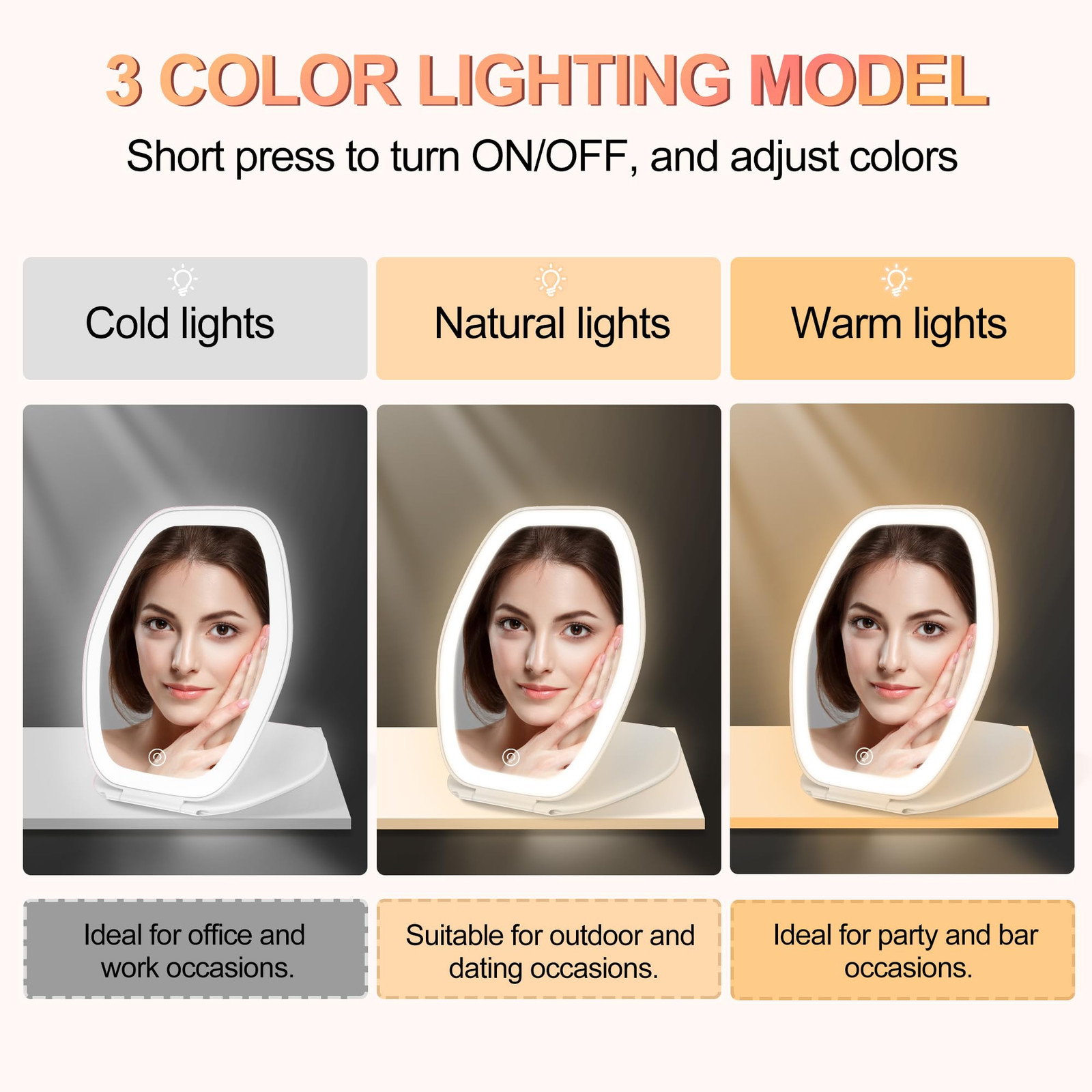 3 Color Lighted Makeup Mirror: This vanity mirror with 72 LEDS features 3 different lighting - cold light, natural light and warm light. Cold light is great for use in office. Natural light is perfect for use in the outdoor. Warm light is great for parties or dinners Dimmable Touch Screen:This light up mirror by the highly sensitive touch control lets you adjust the brightness to your liking. Hold the screen touch button for seconds to dim or brighten the light Portable&Convenient: Our LED makeup mirror is designed to be compact and travel-friendly. With dimensions of 5*7 inches and weighing only 280 grams, it is slim, lightweight, and easily foldable, making it even more convenient to carry around. Therefore, it easily fits into your bag or suitcase, allowing you to do your makeup on the go Rechargeable Makeup Mirror: The travel vanity mirror with a built-in 1000mAh lithium battery comes with a Type-C charging cable, the LED makeup mirror can be used continuously for up to 2 weeks in full charge. A good ideal for travel, home, or any cosmetic occasion. Travel essential for women Perfect Gift: The cosmetic mirror is made of high-quality ABS and glass material, without any magnification and distortion. Perfect gift for daughter, girls friends, wife, mother and yourself.