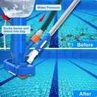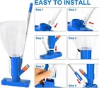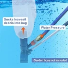 This easy to assemble underwater cleaner is simply powered by the water pressure from a garden hose. The water from the hose enters the vacuum and creates a suction effect, which pulls dirt and debris into the fine nylon mesh collection bag. No pump or filter is necessary. Saves water, no need to empty the pool to clean. Features: Underwater vacuum cleaner, equipped with 48-inch aluminum poles and brushes, its design is simple, easy to install and disassemble. No Electric Power Needed: This universal garden hose adapter attaches to any standard garden hose. The water pressure from your garden hose creates a venturi effect, which draws leaves and other debris into the collection bag (No electricity required). Cleanliness is related to the amount of water pressure. Wide Application: Equipped with 2 wheels and 3 cleaning brushes, immediately suck up all the leaves, bugs and debris from the bottom and surface of the pool. Ideal for cleaning above ground pools, inflatable pool,hot tub, pond, spa, lake and fountain. This is the perfect tool to help you clean hot tubs, inflatable pools, indoor small swimming pools, spas, ponds, and lakes. Package: 1* suction tip 1* mesh bag 1* quick connector 1* buckle 5* pole handle 1* inlet