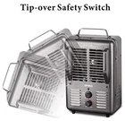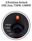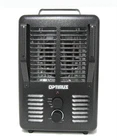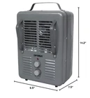 Portable Utility Heater with Thermostat * 2 Heat settings (1300 and 1500 watts) * 4 Position Function Switch (Off, Fan, Low and Hi) * Automatic Thermostat Control * Tip-Over Safety Switch * Internal Heat Limiting Thermostat with Thermal Cut-Off Safety Device * Overheat Protection Circuit * Built-in Carrying Handle * Power indicator light Portable utility heater with automatic thermostat control 4-position function switch for off, fan only, low heat, or high heat Tip-over safety switch; internal heat-limiting thermostat; overheat protection circuit Power indicator light; built-in carrying handle; heavy-gauge sheet-metal cabinet Measures approximately 10 by 8 by 14 inches; 1-year limited