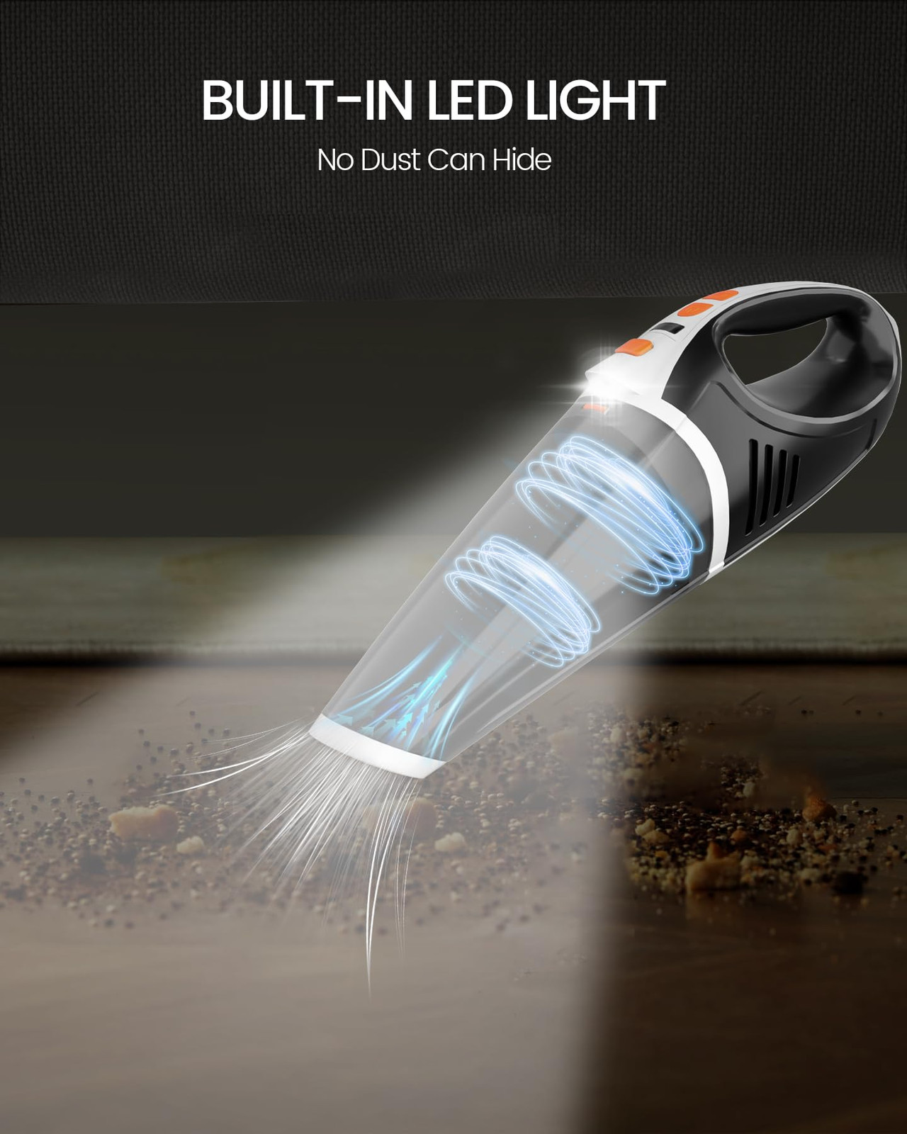BRUSHLESS MOTOR & 15000PA POWERFUL SUCTION: SM05BS handheld vacuum cordless is equipped with the latest brushless motor which can provide strong suction power of Max 15kPa to effortlessly pick up stubborn dust, debris, peels and pet hair from your home, car or office. It has dual suction modes, ECO-10KPa and MAX-15KPa, for a different cleaning experience! Compared to others, SM05BS mini vacuum cleaner has the advantages of stronger suction power, longer service life and lower noise. ANTI-CLOG FEATURE AND METAL FILTER: This pet hair hand held vacuum has an intelligent protection feature that will reduce power or stop working to protect the motor if the filter becomes clogged with debris. At this point the indicator light on the top of the portable vacuum cordless will light up and you will need to clean the dust cup and filter to continue using it. Built-in washable metal filter traps 99.97% of fine dust particles, ensuring clean exhaust air and protecting people's health. LONG RUNTIME & EASY TO CLEAN: This mini vacuum comes with a built-in 2500mAh*3 rechargeable battery that lasts up to 30 minutes in ECO mode and can be fully charged in 3-4 hours. The large capacity 850 ml dust cup allows you to collect more waste at once and reduce frequent cleaning. When cleaning, just tap the switch to separate the dust cup from the portable vacuum for car, making trash disposal quick and easy. 3 PRACTICAL ACCESSORIES & LED LIGHT: This car vacuum cleaner includes a car detailing kit with a crevice tool, floor brush and dust brush. The cordless and ergonomic design makes this small vacuum cleaner easy to hold for cleaning pet hair from your sofa or for cleaning hard-to-reach areas such as nooks and crannies. Meanwhile, this hand vacuum cordless comes with an LED light, so there's no place for trash to hide in the dark! SUPERIOR QUALITY & CUSTOMER SUPPORT: Manufactured with superior quality and durable materials, the SM05BS car vacuum is built to last. Experience reliable performance and longevity that will exceed your expectations. At the same time, we offer 24 H/7 days online response. If you have any questions or problems about the aspiradora para carro, please get in touch with our team and we will give you a satisfactory answer!
