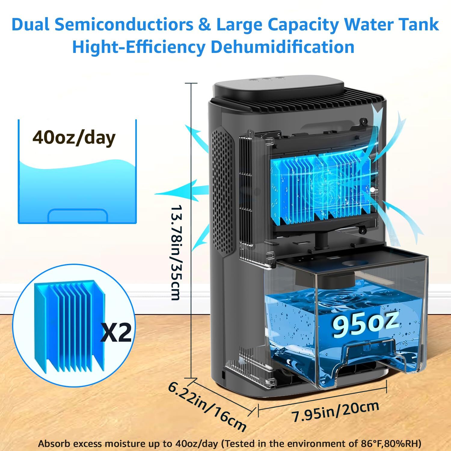 POWERFUL PERFORMANCE: Our small dehumidifier effectively absorbs up to 40oz excess moisture per day (Tested at 86°F, 80% RH), keeps the room humidity below 45%-65% (The suitable humidity for the human body is 40%-60%), Basement dehumidifier is effectively eliminate damp odor and improve human comfort. Dehumidifiers can cover 1000 sq ft and are perfect for bathrooms, basements, bedrooms, and RVs. SLEEP WELL: Thanks to advanced semiconductor technology, in sleep mode, the bathroom dehumidifier's noise level is as low as 30 decibels, which will not keep you awake at night, and the lights will automatically turn off. OVERFLOW AUTO STOP PROTECTION: Our small room dehumidifier is designed with a smart auto stop function. When the water tank is full or positioned incorrectly, a home dehumidifier will automatically stop working to prevent water overflow. This feature ensures your safety and convenience, even when you're not at home. To reduce the frequency of emptying the water tank, we specially equipped the dehumidifier with a 95-ounce large-capacity water tank. USER-FRIENDLY: Simple design, Sets up in seconds. just a couple of buttons to control power, lights, and quiet(sleep) mode. With a compact size of 13.78X7.95X6.22 inches, it can be seamlessly integrated into any space. 7 COLOR NIGHT LIGHTS: The smart dehumidifier is also equipped with a beautiful LED light, which not only adds a touch of elegance to the device but also acts as a functional indicator light (a red light turns on when the tank is full or in the wrong position), even in dimly lit rooms, the soft lighting also allows you to easily monitor the status of your equipment, ensuring you are always aware of its performance.