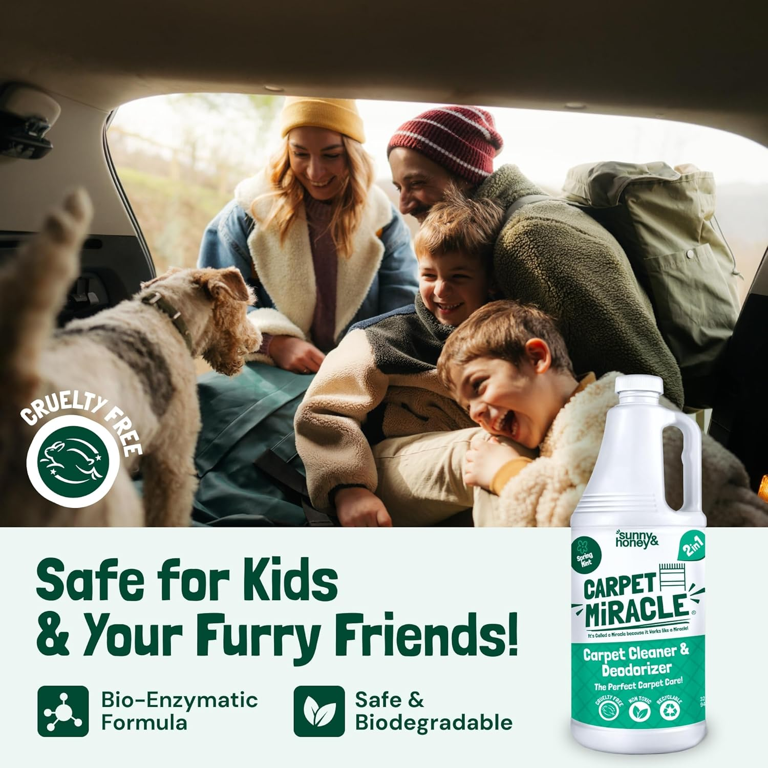 Universal Carpet Cleaning: This USA-made Sunny & Honey carpet cleaner solution works with major carpet cleaner machines like Bissell, Hoover, and Rug Doctor. Also great for rental machines from Home Depot, Lowe's, Walmart, and ACE. This carpet cleaning solution is perfect for tackling any carpet cleaning task Heavy Duty Cleaning: Got tough stains? Our carpet detergent is super concentrated, so you only need a little to make a big impact. This powerful carpet cleaner formula effectively handles old stains, giving your carpets a fresh start without harsh odors Fresh Scent Neutralizer: Struggling with bad surface smells? Our carpet cleaner products not only tackle odors but leave a light spring mint scent. This multi-surface carpet deodorizer handles tough spots, making your carpets and rugs feel renewed Natural And Safe: Created with your family and pets in mind, our carpet shampoo solution is biodegradable. This pet carpet cleaner solution, certified cruelty-free, uses clean ingredients with essential oils. This carpet cleaner for pets is safe for all home environments Revive Your Carpets: Rediscover the beauty of your carpets and upholstery with our carpet cleaner solution for machine. This carpet stain remover for old stains doesn’t leave residue and works on various stains. Your floors will look and smell like a dream, even for pet owners with our upholstery cleaner solution Smells And Looks Like A Dream: Imagine your upholstery looking new! This rug cleaner solution won't cause build-up or residue and works on many stains. The carpet cleaner products don’t just eliminate odors; they leave a fresh and light scent after use Product Description Sunny & Honey Carpet Miracle Cleaner Solution Reclaim the Joy of a Clean Home Clean Today, Fresh Tomorrow Remember the joy of a clean home? We help you reclaim that peace. A clean home means well-being! Especially for families with children and pets. Our product is designed with safety and efficiency in mind, allowing you to create a comforting space where your loved ones thrive. Nurture your home with thoughtful touches, and give your loved ones what they deserve. Easy & Fast Show Love to Your Carpet! Tired of spending hours scrubbing your carpets? Our carpet cleaner makes deep cleaning a breeze! Simply mix, pour, and clean – your new powerful formula tackles even the toughest pet stains and ground-in dirt in minutes! Imagine sinking your feet into soft, freshly cleaned carpets. Let's reach this feeling together! Leaping Bunny Certified and safe for kids and pets, it's the perfect solution for busy households. From Stubborn Stains to Spotless Clean Protect What Matters We know how it feels to come home to an accident caused by your little family member – your loving pet. They did not mean to do it – it just happened. Sunny & Honey Carpet Miracle together with Fabric Spot & Stain Miracle are a versatile cleaning solution that works wonders on even the toughest stains and odors. The video showcases the product in use. The video guides you through product setup. The video compares multiple products. The video shows the product being unpacked. The Perfect Balance for Sensitive Noses Our product is crafted to be gentle yet effective, delivering a brighter home while ensuring that your most cherished companions—your children and pets—are safe. Fresh Home, Happy Family Breathe easy, knowing that your family can enjoy a clean, fresh environment. With Carpet Miracle, you’re nurturing a healthy home where memories are made, laughter echoes, and every corner feels just right. Discover Sunny & Honey Product Line Add to Cart Add to Cart Add to Cart Add to Cart Add to Cart Add to Cart Add to Cart Customer Reviews 4.4 out of 5 stars 14,734 4.4 out of 5 stars 14,734 4.2 out of 5 stars 34 4.4 out of 5 stars 14,734 4.5 out of 5 stars 10 4.4 out of 5 stars 14,734 4.4 out of 5 stars 14,734 Price $49.99 $ 49 . 99 $19.99 $ 19 . 99 $18.99 $ 18 . 99 $49.99 $ 49 . 99 $49.99 $ 49 . 99 $20.99 $ 20 . 99 $20.99 $ 20 . 99 Size 128 FL OZ (1 Gallon) 32 FL OZ 32 FL OZ 128 FL OZ (1 Gallon) 128 FL OZ (1 Gallon) 20 OZ (567 g) 20 OZ (567 g) Item Form Liquid Liquid Liquid Liquid Liquid Powder Powder Machine-use ✔ ✔ ✘ ✔ ✔ ✘ ✘ Full Carpet Cleaning ✔ ✔ ✘ ✔ ✔ ✔ ✔ Leaping Bunny Certified ✔ ✔ ✔ ✔ ✔ ✔ ✔ Bio-Enzymatic Formula ✔ ✔ ✔ ✔ ✔ ✘ ✘ Safe for Pets & Kids ✔ ✔ ✔ ✔ ✔ ✔ ✔ Made in USA ✔ ✔ ✔ ✔ ✔ ✔ ✔