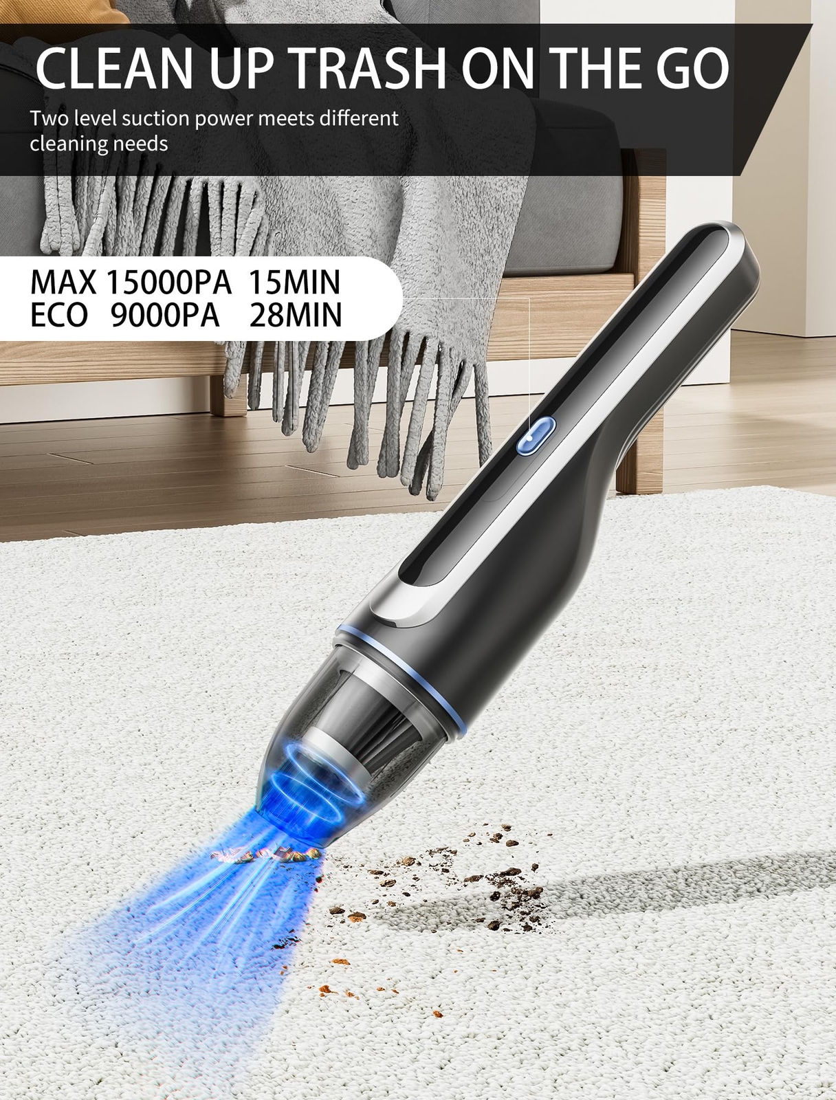 Temp Ultra Lightweight & Cordless Freedom: Weighing only 1.2 lbs (about the same as a water bottle!), this handheld vacuum is perfect for effortless, one-handed cleaning. Its ergonomic, anti-slip handle makes car cleaning easy and frustration-free. The cordless design lets you move freely and clean anywhere—at home or on the go! Fast Charging & Long Battery Life: Charge up in just 2 hours, and enjoy up to 28 minutes of cleaning on Eco mode (12-14 minutes on max). The USB-C charging port adds convenience, letting you power up at home, in the car, or anywhere you go. Includes a storage cap for easy placement on your desktop or in a drawer. Powerful Suction with Brushless Motor: With a high-speed brushless motor delivering 15,000 Pa suction in max mode, this vacuum quickly picks up dust, crumbs, pet hair, and more. It offers two suction levels, so you can switch between standard and strong modes to handle any cleaning task. 2-in-1 Cleaning Tool & LED Light: Equipped with a 2-in-1 tool, this vacuum makes cleaning tricky spots a breeze. Use the crevice nozzle for tight gaps and the brush nozzle for surfaces like upholstery or pet hair. The bright LED light ensures no debris hides, even in dark areas! Quiet Operation & Dual Washable Filters: This vacuum operates at a low 65 dB, allowing for quieter cleaning. Plus, it includes two washable filters that capture dust efficiently and extend the vacuum’s lifespan.