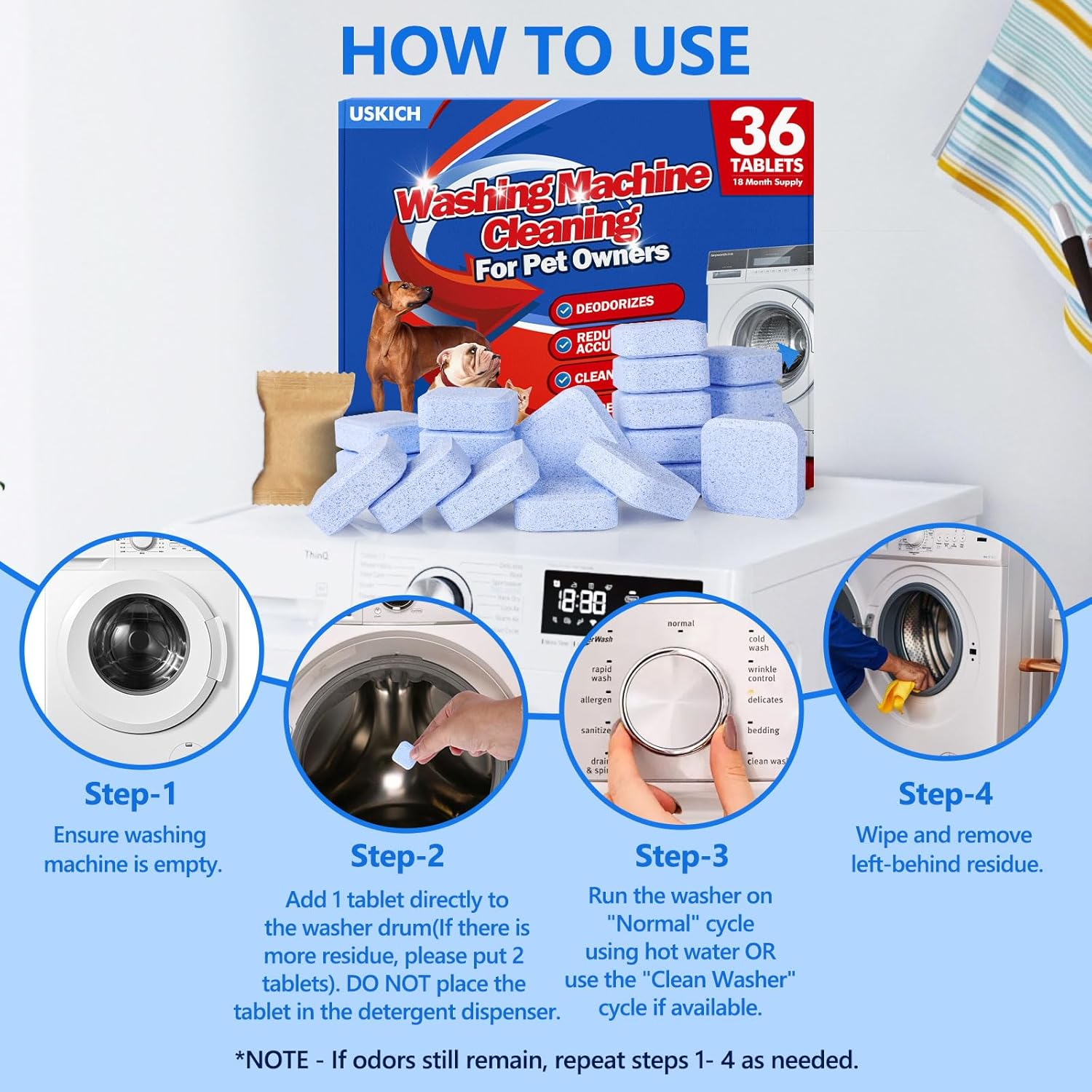 Powerful Cleaning Pet Odors From Your Washing Machine: Cleaner pro pet hair remover contain tea polyphenols, lipase, sodium polyacrylate, sodium percarbonate, sodium carbonate and citric acid, specially formulated to remove odours, dirt, and other residue from washing machines, leaving your washing machine smelling fresh and clean with every wash Reduces Pet Hair Buildup: Pet hair remover for laundry e specially formulated for households with pets, the special blend of active enzymes in our washer machine cleaner tablets help dissolve hair and fur, reducing washing machine clogging and buildup! Extends Machine Lifespan: Washing machine cleaner pro with 36 tablets per pack, an 18 month supply ensures your washing machine is used every month or every 30th wash, optimizing the performance and extending the life of your washing machine, keeping it fresh How to Use: Our laundry machine cleaner are very easy to use. Simply place one cleaning tablet into the washing machine drum (or 2 if there is a lot of residue), run a hot cycle without any laundry, allow the cleaning tablet to dissolve and release cleaning foam that reach every corner of the machine, and finally wipe away the residue with a towel. Perfect For All Washers: These cleaner pro pet hair remover work with all types of washing machines, including front-load washers, top-load washers, and HE machines.Washer cleaner and deodorizer will refresh your laundry machine basket, rubber gasket and internal parts, so your clothes will be clean and smell fresh. Washing Machine Cleaner Powerful Cleaning Pet Odors From Your Washing Machine Washing Machine Cleaning Tablets Pet hair dissolver for washing machine specially formulated to remove odours, dirt, and other residue from washing machines, leaving your washing machine smelling fresh and clean with every wash BR> Washer Machine Cleaner Tablets Washer cleaner and deodorizer will refresh your laundry machine basket, rubber gasket and internal parts, optimizing the performance and extending the life of your washing machine, keeping it fresh and efficient all year round.