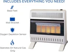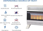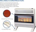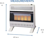 ProCom MN300TPA-B Ventless Natural Gas Infrared Space Heater 30000 BTU, White Product Details Brand: ProCom Special Feature: Overheat Protection Color: White Form Factor: [POSSIBLE] Pedestal Indoor/Outdoor Usage: Indoor Product Dimensions: 8"D x 26.63"W x 23.5"H Recommended Uses For Product: Office, Home Mounting Type: Floor Mount Room Type: Bedroom, Home Office, Study Room Heating Coverage: 1400 sq.ft. Burner type: Radiant Heat Output: 30000 British Thermal Units Fuel Type: Natural Gas Item Weight: 34.3 pounds Manufacturer: ProCom Country of Origin: USA Item model number: MN300TPA-B Care instructions: Hand Wash Assembly required: No Number of pieces: 1 Batteries required: No Included Components: Ventless Infrared Plaque Heater with Base Feet Power SourceHeating Method: Gas PoweredRadiant TECHNOLOGY: This compact Infrared mini heater produces 30000 Maximum BTU using Natural Gas and heats up to 1400 sq. ft. area; This is a great heater for office, bedroom, living room, and other residential use DEPENDABLE: Thermostat control on the heater offers High/Medium/Low Thermostat Control; Ideal for greater heat flow that could add a warm atmosphere as a small space heater STYLISH: Without compromising function for beauty, this versatile small heater has been redesigned for a slim & modern profile to effortlessly fit in your room; Mount on a wall with included hardware or place on a floor with Base Feet (Included) SAFE: Push button ignition with built-in pilot oxygen depletion sensor (ODS) immediately shuts down the garage heater if carbon monoxide or lack of oxygen is detected; ANSI Certified to ensure safety CONVENIENT: No electricity is required for this personal heater, making it perfect for power outages or any in-house emergencies; Includes Wall Mount and Base Feet ProCom Natural Gas Ventless Infrared Plaque Heater with Base Feet - 30,000 BTU, T-Stat Control - Model# MN300TPA-B