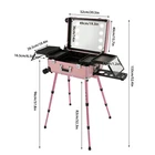 Professional Cosmetic Travel Case Vanity Organizer Rolling Makeup Train Case Box Professional Cosmetic Travel Case Vanity Organizer Rolling Makeup Train Case Description If you are a make-up artist and embroiderer who often needs to go out to work, you will need our makeup train case, combining the suitcase with the four legs, which is very convenient. Our makeup train case with high durability, 4 universal wheels, a large capacity, built-in LED 3-color lights, and a chargeable design will be your excellent makeup assistant when outgoing. Key Features Long Service Life: With the high-quality aluminum alloy and decorative high-pressure laminate, this product is anti-corrosion, flame-resistant , and rustproof and is not easily deformed, thus ensuring a long service life. Large Capacity: The 3-tier design with 5 collapsible&detachable inner boxes and a makeup brush holder can orderly sort and store your makeup/tools while well protecting them from scratches because of PU&MDF lining. And the retractable side tray can hold your hairdryer, flat iron, curling iron, etc. Excellent Load-bearing Capacity: The four supporting feet at the bottom and the aluminum alloy frame provide the make-up case with a maximum weight-bearing capacity of 110.23 lbs. You can place all kinds of hairdressing and beauty tools on it with confidence. Professional Make-up Assistant: The 8 LED lights(each 2.17" in diameter) with adjustable brightness and 3 light colors(warm, natural, and cold light) provide an ideal view for your different makeup needs without worrying about unwanted glare/shadows while protecting your eyes, together with the high-transparency resin mirror, helping you achieve flawless professional makeup. You can long press the button on the mirror to adjust the brightness and short press it to change the light color. Adjustable Height: With the 4-gear height adjustable quadripod(32.3 inches), you can find the height that suits you best to have enjoyable makeup without back pain . Built-in Retractable Quardipod: The built-in retractable quardipod can be stretched when needed or folded when not in use, enabling quick switching between the two usage modes without disassembly. The adjustable foot pads of the quardipod adapt to uneven ground. Thoughtful Design: The 12V rechargeable jack, external power supply jack, and power jack with a dustproof cover on the case will bring more convenience to your operation. Stylish Appearance: The rectangular frame with simple&elegant lines and lively pink embellished with a little black&silver gives this product a stylish look, which is a brilliant view when you are carrying it outside. Ideal Gift: Its exquisite design and large capacity make this product a great gift to your mother, girlfriend, sisters, wife, and loved ones. They would be fond of it. Easy to Move&Carry: The 4 nylon universal wheels ensure silent and smooth rolling and its detachable design allows for convenient replacement. Along with the telescopic pull rod and 2 comfortable handles, you can carry this product with less effort. Protective Shipping: In order to prevent the product from being damaged and bumped during transportation, we fill the package with anti-collision foam to protect your products to the maximum extent possible. Specifications Alloy Cladding Corners: The alloy cladding corners with a round design can not only protect your case from Verdana but also better care for your skin. Flat Built-in Bulb: This design makes the bulbs not easy to break. When the case is closed, it does not occupy the interior space of the case. Non-slip Feet: The non-slip feet enhance the stability of the product without slipping and bring you a better user experience. Clear Inner Box Lid: The clear inner box lid with a latch lock allows you to view the inside items and avoids them from falling. Locks and Latch: The two locks on the side and the latch on the top are solid and durable to effectively protect the inside items from losing. Application Professional makeup artists, hairdressers, beauticians, manicurists, beauty lovers, etc. can use this product to store cosmetics and makeup tools. It is ideal for makeup contests, wedding makeup scenarios, travel makeup, outdoor shooting, cinemas, dressing rooms, crew, tourism, beauty salons, and more. How to Use 1. Open the bottom plate buckle. 2. Extract the quardipod and clamp it in place. 3. Adjust the suitable length. 4. Place the product upright. 5. Open the box. 6. Open the lock inside the box and pull out the small box inside. 7. Connect the power supply as needed and start using it. Specification Color: Pink Shape: Rectangular Material: Aluminum Alloy, Decorative High-pressure Laminate, Resin Wheel Material: Nylon Surface Treatment: Oxidation Plug: US Standard Mounting Type: Free Standing Light Color Type: Warm Light, Neutral Light, Cold Light Number of Wheels: 4 Voltage: 12V Bulb Type: 8*5W LED Bulbs (Included) Max. Load-bearing Capacity: 50kg/110.23lbs Gross Weight: 14kg/30.86lbs Net Weight: 12kg/26.46lbs Each Light Source Diameter: 5.5cm/2.17inch Mirror Size(L*W): 49*36cm/19.3*14inch Each Tray Size: 16.5*26.5*3cm/6.5*10.4*1.2inch Top Cover Size(L*W): 52*40cm/20.5*15.7inch Overall Height: 133cm/52.4inch Supporting Leg Max. Height: 82cm/32.3inch Tray Distance From Floor: 96cm/37.8in Package Size: 67.5*51*29cm/26.57*20.08*11.42inch Package Included 1 x Makeup Train Case 2 x Power Cords 1x USB Cable 2 x Keys Notes Please do not use high-voltage plugs as they may burn out the product. This product is an 8-light model without audio and Bluetooth functions. The support legs need to be tightened slightly before being supported. The service wear of the case is a normal phenomenon. In the process of daily use, please try to avoid excessive Verdana and drop to extend the lifespan of the product. Please use soft tools and water to clean. Please keep away from corrosive liquids. Please avoid long-term exposure to the sun. Please clear the wheels in time to maintain smoo