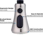 Pull Down Spray Head for Kitchen Faucet, NSF/ANSI/CAN 61 & CUPC Certified 3-Function Spray Nozzle, 15 Adapters, Sink Faucet Head Compatible with Moen, Delta, Kohler, Brushed Nickel Easily Switch Between 3 Modes: The kitchen faucet sprayer head has stream, spray, and high-pressure rinsing modes; The unique-designed high-pressure rinsing mode is a very strong power mode, which can easily flush the food debris with blade water; Simply press and release the button to switch between 3 modes Available In 15 Connection Sizes: This pull-down spray head comes with 15 adapters for various connections that are compatible with major product faucet hoses, not to compatible with American Standard, Moen, Delta, AquaSource, Kohler, Hansgrohe and Grohe (Pfister or Glacier not included). Please note that this spray head is not suitable for RV faucets Removable & Washable Faucet Aerator: An aerator key is included for removing or replacing the faucet aerator to clean; The interior multi-mesh aerator creates a quiet no-splashing aerated stream; The aerator can be removed and cleaned to ensure clean water and continuous flow Quality & No Dripping: This kitchen faucet head is crafted from high-grade PC/ABS engineering plastic, featuring an ergonomic design and an industry-leading finish that resists scratches, ensures longevity, and effectively withstands rust. Certified by NSF, cUPC, and low-lead standards, it meets strict safety and performance standards Easy to Install: It's very easy to install the sink faucet head, simply unscrew your old shower head and replace it with the new one; No tools are needed