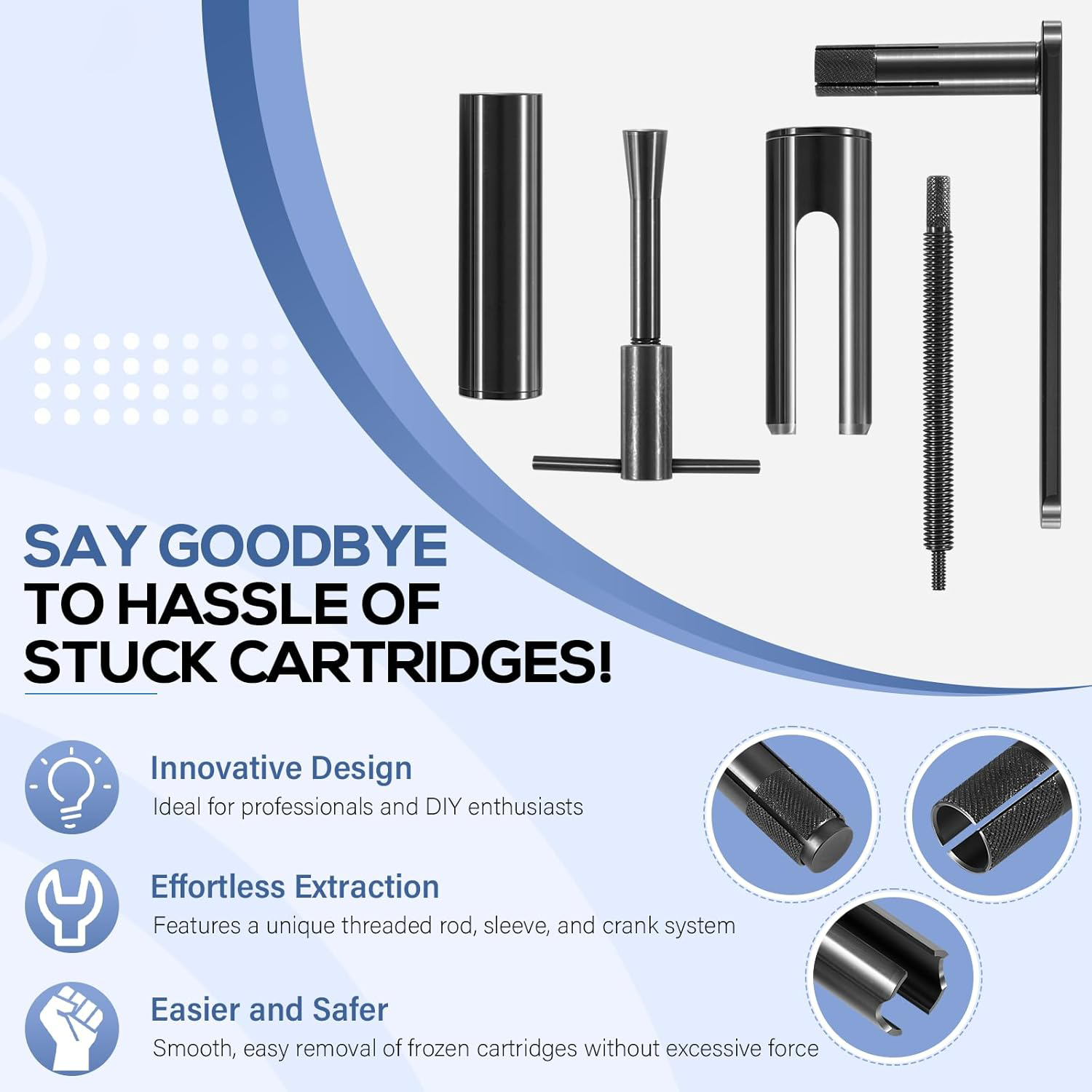 Puller Premier For Moen Cartridge Extractor Tool Posi-Temp 1222, 1225 and 1200 Features: Widely Fitment -- 999150 Shower cartridge puller tool fits for Moen single handle faucets 1200 and 1225, for Moen Posi-Temp 1200 shower cartridge. Innovative Design -- Features a unique threaded rod, sleeve, and crank system that eliminates the need for brute force, making the extraction process easier and safer for your plumbing fixtures. Effortless Extraction -- Say goodbye to the hassle of stuck cartridges! Designed for repeated use by professionals, our cartridge extractor tool allows for smooth, easy removal of frozen cartridges without excessive force. Jaga-tools In Search of Excellence! Puller Premier For Moen Cartridge Extractor Tool Posi-Temp 1222, 1225 and 1200 Puller Premier For Moen Cartridge Extractor Tool Posi-Temp 1222, 1225 and 1200 Features: Widely Fitment -- 999150 Shower cartridge puller tool fits for Moen single handle faucets 1200 and 1225, for Moen Posi-Temp 1200 shower cartridge. Innovative Design -- Features a unique threaded rod, sleeve, and crank system that eliminates the need for brute force, making the extraction process easier and safer for your plumbing fixtures. Effortless Extraction -- Say goodbye to the hassle of stuck cartridges! Designed for repeated use by professionals, our cartridge extractor tool allows for smooth, easy removal of frozen cartridges without excessive force. Comprehensive Kit -- Cartridge removal kit includes model # 999150 for Moen 1220 and 1225 cartridges, and model # 999150-6 designed for hassle-free extraction of 1222 series Posi-Temp cartridges. Excellent Quality -- Constructed from premium steel and finished with coating to prevent corrosion, rust and oxidation. Hardened construction offers high strength and impact resistance for long service life. Package Included: 999150 Shower Cartridge Removal Tool Item Specifics Brand JT-Motor Type Shower Cartridge Extractor Tool MPN 999150 Warranty 1 Year Material Stainless Steel Features Easy installtion Item Weight 2 pounds Color Black Set or dingle item Set Batteries Included No Batteries Required No Number in Pack 5 Payment Returns Jaga-tools In Search of Excellence! DESCRIPTION PAYMENT SHIPPING RETURN POLICY Puller Premier For Moen Cartridge Extractor Tool Posi-Temp 1222, 1225 and 1200 Puller Premier For Moen Cartridge Extractor Tool Posi-Temp 1222, 1225 and 1200 Features: Widely Fitment -- 999150 Shower cartridge puller tool fits for Moen single handle faucets 1200 and 1225, for Moen Posi-Temp 1200 shower cartridge. Innovative Design -- Features a unique threaded rod, sleeve, and crank system that eliminates the need for brute force, making the extraction process easier and safer for your plumbing fixtures. Effortless Extraction -- Say goodbye to the hassle of stuck cartridges! Designed for repeated use by professionals, our cartridge extractor tool allows for smooth, easy removal of frozen cartridges without excessive force. Comprehensive Kit -- Cartridge removal kit includes model # 999150 for Moen 1220 and 1225 cartridges, and model # 999150-6 designed for hassle-free extraction of 1222 series Posi-Temp cartridges. Excellent Quality -- Constructed from premium steel and finished with coating to prevent corrosion, rust and oxidation. Hardened construction offers high strength and impact resistance for long service life. Package Included: 999150 Shower Cartridge Removal Tool Payment Returns All rights reserved.