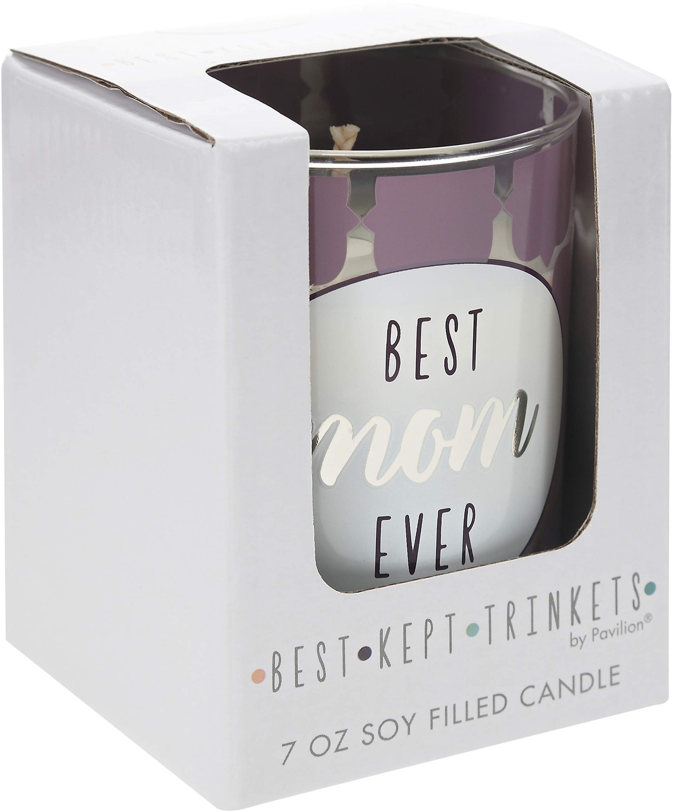 Best Kept Trinkets by Pavilion was designed by our in-house artists. Featuring cute patterns and colors that are perfect for the girls in your life. Once the candles have burned away, the glass containers can be re-used to hold keepsakes, change or jewelry for years to come. PREMIUM QUALITY: 4" candle, packaged in a printed open-faced box, is made from glass and 100% soy wax and features a fresh cotton scent. IN-HOUSE DESIGN: "Best Mom Ever" text decal and accompanying design are printed onto the candle. PERFECT GIFT: Great for gifting to a mom. CARE INSTRUCTIONS: Wipe clean only with a damp cloth. Always take care around an open flame. Lead-free cotton wick. MORE PRODUCTS: Photo frames, mugs, and trinket dishes in the same style are also available.