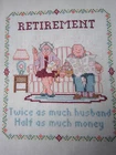 HAND-STITCHED CROSS-STITCH PILLOW TOP "RETIREMENT ----- TWICE AS MUCH HUSBAND, HALF AS MUCH MONEY" MEASURES 13 1/2" X 11" READY TO BE MADE INTO A PILLOW EXCELLENT CONDITION ---- NICELY STITCHED! Please e-mail me with your questions before making a purchase, as all sales are final with no return or refund. Thank you for looking!