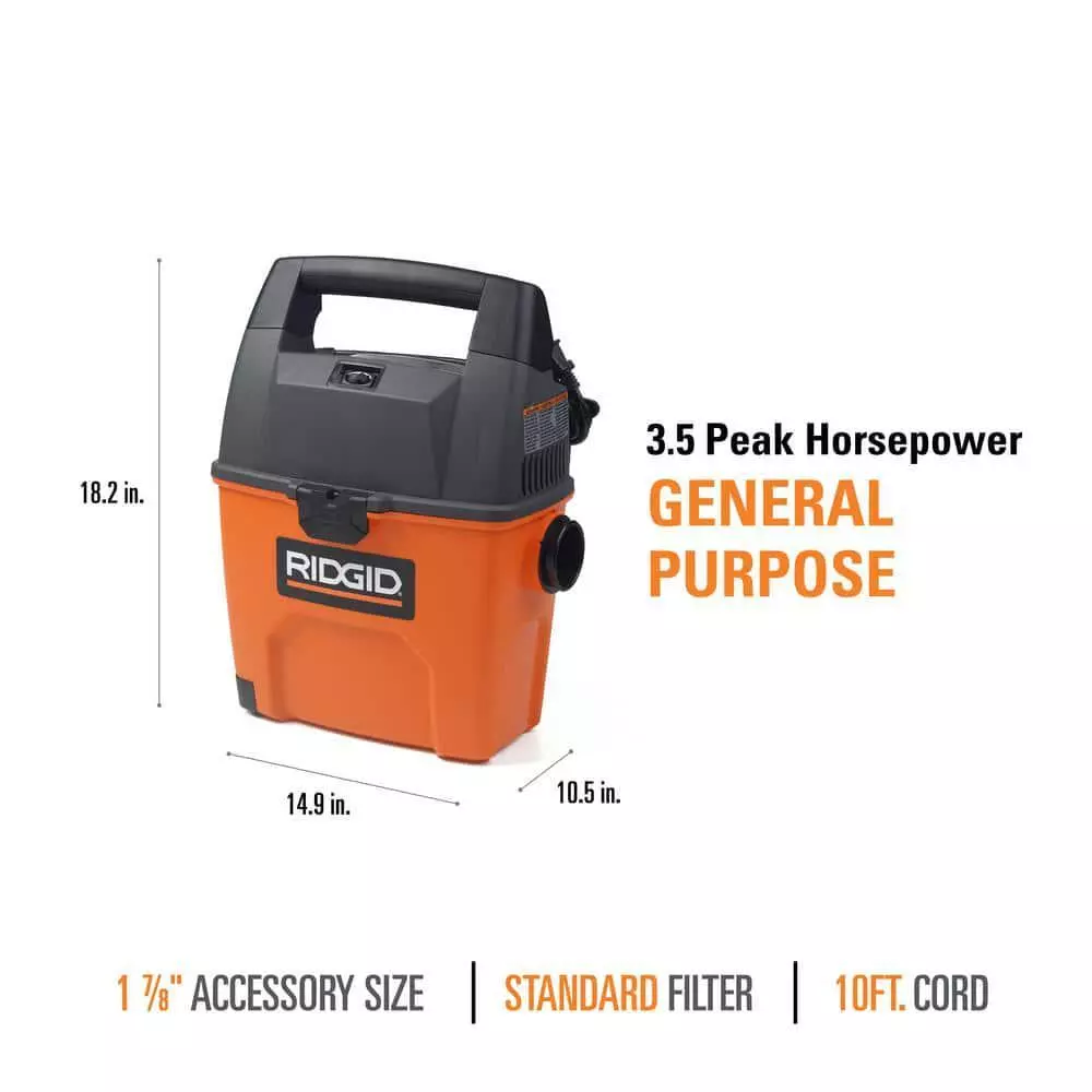 RIDGID 3 Gal 3.5 Peak HP Handheld Shop Vac Wet Dry Vacuum with RIDGID SWEEP Dust Pan, Filter, Locking Hose and Car Nozzle About This Product The RIDGID 3 Gal. 3.5 Peak Horsepower Portable Wet Dry Shop Vacuum with built-in RIDGID SWEEP dustpan feature is a compact and portable vacuum that is designed to deliver powerful performance. The 3-Gal. shop vac is lightweight and makes it easy to take the vac with you on road trips, use it around the house, or for smaller messes. The included car nozzle is designed to clean upholstery and carpet and can be stored onboard the vac when not in use. Its small size and large carry handle provide comfortable portability. Store it easily in your garage or workshop. The innovative RIDGID SWEEP feature is a suction-powered dustpan built right into the shop vac - sweep the dust directly into the shop vac or use it to glide over spilled areas. The wet dry vacuum's 3.5 peak horsepower motor, 10 ft. power cord, locking expandable hose, and filter will please pro's and DIYers alike. The RIDGID 3 Gal. wet dry vac shop vac also comes with a general debris filter (VF3400) and is compatible with other filters for any job or mess pickup (VF3500, VF3600, VF3700 and VF3800; sold separately). Replace RIDGID wet dry vac filters frequently to maintain optimal vacuum performance and protect motor. Highlights RIDGID 3 Gallon 3.5 Peak Horsepower Wet/Dry Shop Vacuum with built-in "RIDGID SWEEP" Dustpan provides powerful suction while offering the freedom and convenience of portability Perfect for general household cleanup, small garage and basement messes, and areas around workstations Includes 1-7/8 in. attachments: hose, car nozzle Filtration includes general debris wet/dry vac filter (VF3400) for capturing general dirt and Qwik Lock filter snaps on or off the wet/dry shop vac for easy cleaning Weighing less than 10 lbs., and the integrated large carry-handle makes this vacuum easy to transport, with a compact size for stowing in small spaces Integrated RIDGID SWEEP suction-powered dustpan makes cleaning even easier, sucking up debris as it is swept right in Use the onboard cord wrap for storage of the 10 ft. power cord and the cord has a quick-release option so you can spend your time cleaning, not unwrapping the cord Accessory storage space gives you quick access to the included car nozzle 1-7/8 in. diameter hose offers non-clogging performance like larger diameter hoses with the flexibility of smaller diameter hoses Car nozzle is perfect for soft surface areas in your car and home Replace your filters often to prolong the life of your shop vac and reduce suction power loss RIDGID offers additional replacement filtration options (VF3400 general debris filter, VF3500 fine dust filter, VF3600 HEPA material filter, VF3700 wet application filter, and VF3800 HEPA filter; sold separately) that capture a variety of dirt and debris and VF3501 Size C dust collection bags (sold separately) for quick and easy cleanups Gallons indicated reflect drum volume, not necessarily collection capacity, actual capacity dependent upon type of debris collected, condition of filter and other factors Peak Horsepower represents a level at or below the maximum horsepower output of an electric motor tested in a laboratory using a dynamometer Dimensions Hose Diameter (in) 1.875 in Hose Length (ft.) 7 ft Peak Horsepower (php) 3.5 Product Depth (in.) 10.5 in Product Height (in.) 18.4 in Product Width (in.) 24 in Details Air Volume (CFM) 62 Amperage (amps) 7 Blower Port Not Included Color Family Oranges/Peaches Cord Length (ft.) 10 Cordless/Corded Corded Debris Type Dust Mites, General Debris, Pollens, Sawdust Filter Type Cartridge Included Accessories No additional accessories included Power Source Electric Product Weight (lb.) 9.85 lb Recommended Surfaces Auto Interior, Bare Floor, Carpet, Concrete, Laminate, Leather, Stairs, Tile, Upholstery, Vinyl, Wood Tools Product Type Vacuum Vacuum Maximum Capacity (Gallons) 3 gal Voltage (V) 120 V Wet/Dry Attachment & Accessory Type Dust Bin