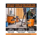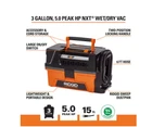 Be prepared for your next mess with the RIDGID 3 Gal. 5.0 Peak HP NXT Wet Dry Vacuum - store it, stack it, move it. The compact, lightweight toolbox design is the perfect companion for those looking for a small yet powerful vac they can take from project to project. Designed with storage in mind, this 3 gal. shop vac fits into small, out-of-the-way spaces with the bonus of stacking. With the integrated storage compartment, accessories are organized and secured onboard so you are ready to grab-and-go at any time. The crevice tool can be used for tight, intricate places. The dusting brush can gently clean surfaces with care. The 6 ft., 1-7/8 in. hose features 360 maneuverability and resists collapsing. The exhaust port allows for blower functionality and the on/off switch can easily be turned on with one hand. The innovative RIDGID SWEEP feature is a suction-powered dustpan built right into the vac - sweep the dust directly into the shop vac or use it to glide over spilled areas. Backed by the full lifetime warranty, RIDGID proves that even the messiest of jobs can be the easiest to handle. Pro Tip: RIDGID filters help to maintain the power of the vac and extend vacuum life. Purchase a shop vac wet filter (VF3700; sold separately) to clean up wet messes or add a RIDGID dust collection bag (VF3501; sold separately) to the shop vacuum to keep the wet dry vac drum clean and for quick pickup and disposal. 18V Cordless 3 Gal. wet dry vac (HD0318) also available. Lightweight, toolbox design for portability, convenience and easy storage i.e. under sinks, behind shelving, inside of small closets and within the bed of trucks Compact and stationary construction keeps vac in one place when working on a job; a great choice for plumbers, electricians and DIYers Enclosed compartment for storing included accessories, hose and cord Large top handle locks into place for a sturdy grip and an oversized on/off switch makes activation effortless with one hand Dusting brush helps remove dirt and debris from delicate surface areas & crevice tool reaches awkward spaces such as between car seats & shelving and behind plumbing and pipes Fine dust filter is designed to capture fine particles such as pollens, dust, mold and cold ashes (Wet spills should be used with a wet application filter - VF3700; sold separately) RIDGID offers a wide range of replacement filtration options (VF3400 general debris filter, VF3500 fine dust filter, VF3600 HEPA material filter, VF3700 wet application filter and VF3800 HEPA filter; sold separately) that capture a variety of dirt and debris and VF3501 Size C dust collection bags (sold separately) for quick and easy cleanups Cordless 3 gallon counterpart also available (HD0318; sold separately) Gallons indicated reflect drum volume, not necessarily collection capacity; actual capacity dependent upon type of debris collected, condition of filter and other factors Peak horsepower represents a level at or below the maximum horsepower output of an electric motor rested in a laboratory using a dynamometer Includes RIDGID 3 Gallon NXT Wet/Dry Vac (corded application), fine dust filter, crevice tool, dusting brush, and 6 ft. collapsible, rubberized hose 5.0 Peak HP motor offers powerful suction for materials such as nails, wood chips, dog food, soil and more 6 ft., 1-7/8 in. hose has rotating hose adapters for better flexibility and mobility while the chamfered hose edge allows for a better pickup experience; depending on your project need and length of reach, use RIDGID replacement hose LA2570, VT1720, or VT1722 (sold separately) Built-in, suction-powered "RIDGID SWEEP" feature for sweeping in dirt and debris or gliding over spilled messes Exhaust port doubles as blower port to clear wood chips, leaves and other debris off surfaces 15 ft. Cord provides extra reach and stores conveniently in the lid Hose Diameter (in) 1.875 in Hose Length (ft.) 6 ft Peak Horsepower (php) 5.0 Product Depth (in.) 10.6 in Product Height (in.) 11.8 in Product Width (in.) 18.8 in Air Volume (CFM) 100 Amperage (amps) 7.8 Blower Port Included Color Family Oranges/Peaches Cord Length (ft.) 15 ft Cordless/Corded Corded Debris Type Cold Ashes, Dust Mites, Fine Powders, General Debris, Pollens, Sawdust Filter Type Cartridge Included Accessories No additional accessories included Power Source Electric Product Weight (lb.) 12.6 lb Recommended Surfaces Bare Floor, Concrete, Laminate, Tile, Vinyl, Wood Tools Product Type Vacuum Vacuum Maximum Capacity (Gallons) 3 gal Voltage (V) 120 V Wet/Dry Attachment & Accessory Type Vacuum