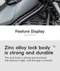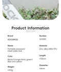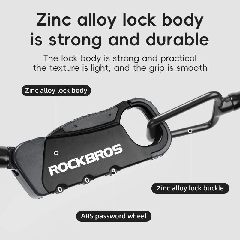 PRODUCT INFORMATION Brand: ROCKBROS Product name: Bicycle cable lock Material: Zinc alloy + ABS + TPU Weight: about 103g Length: about 120cm Color: Black, Orange, Army green, Blue-yellow PASSWORD SETTING 1. Dial the initial password 000 2. Press the side part of the lock 3. Dial the password wheel with the other hand to set the new password 4. Release the side part, password setting complete