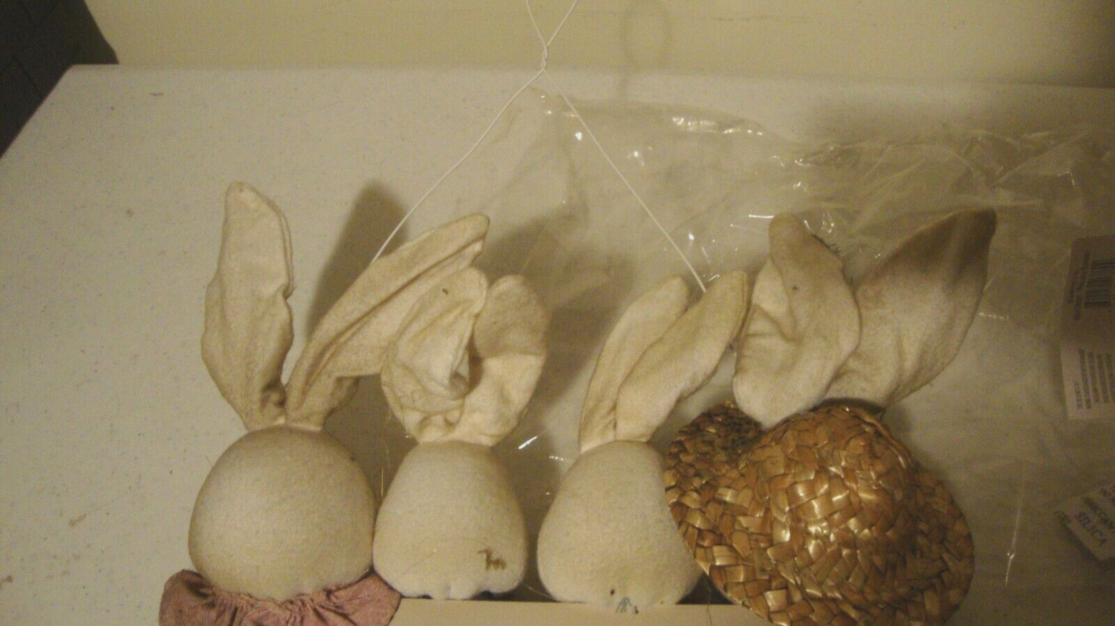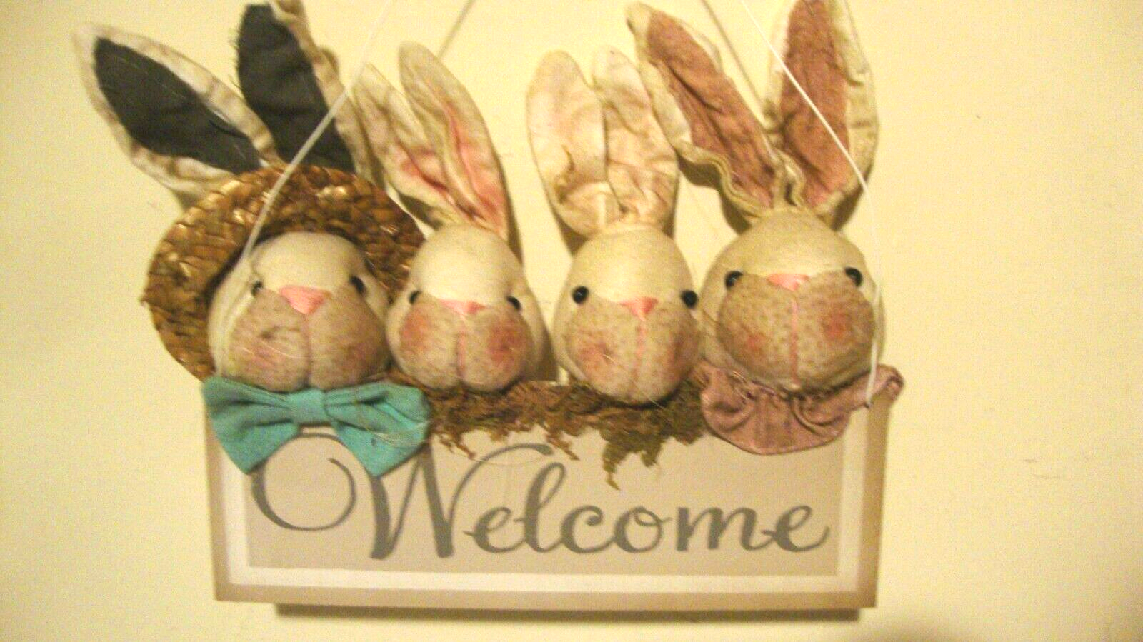 Here is a new spring wall hanger , this is made of wood and fabric and has metal hanger, the wood sign reads Welcome and their is 4 attached bunnies acrossed the sign in multi color clothind and one has attached wicker hat on, this measures 10 inch wide by 10 inch high and is 3 inch in diameter, this would accent any door or wall hook hanging for spring or summer season, and check out my many other nice decor and lighting.