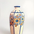Rare, French Art Deco (c. 1920s-30s vintage) vase from Emaux de Longwy is in excellent condition with no chips, cracks hairlines or repairs. Crafted in France between 1920-1930, this large (11.5” high X 5.25” wide. 2” opening) vase features a glazed finish. The raised, relief design with dusty blue and rust leaves and ochre, deep blue and turquoise flowers set against white crackled background with blue vertical stripes make it a unique piece that will surely catch the eye of collectors.