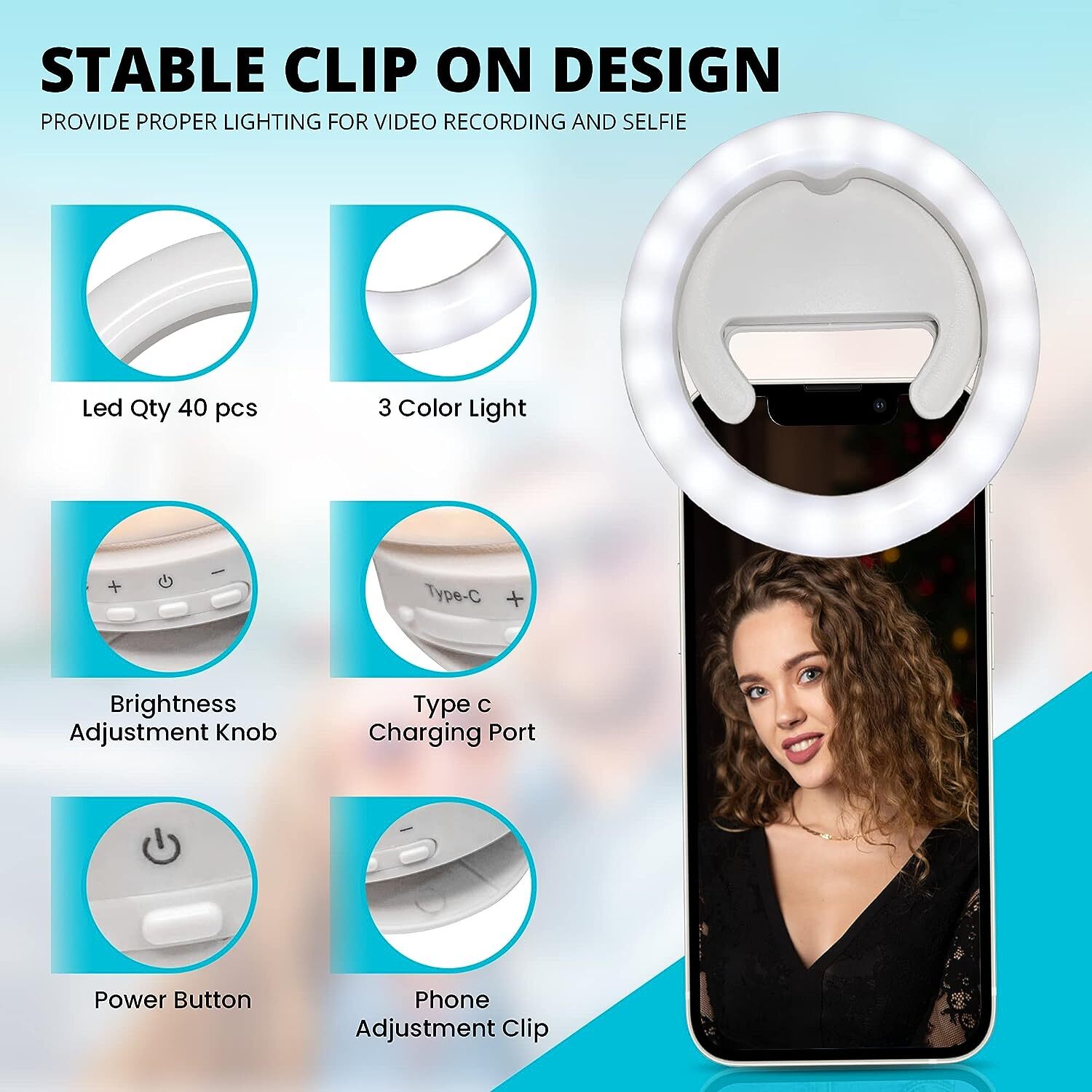 Selfie Ring Light for Phone Rechargeable Cell Phone Ring Light Clip On BRIGHTNESS LEVELS: This selfie ring light has 5 adjustable brightness levels to choose from, so you can customize your lighting to get just the right amount of brightness for the perfect picture. CLIP-ON DESIGN: This selfie ring light features a clip-on design that makes it easy to attach to your phone, iPad, Android or Lap Top. The clip is adjustable, so you can get the perfect angle for the best shots. RECHARGEABLE BATTERY: This selfie ring light is powered by a rechargeable battery (No batterys needed), so you don't have to worry about replacing batteries. The battery can last up to 3 hours on a full charge. PORTABLE DESIGN: This selfie ring light is lightweight and compact, making it easy to take with you on the go. It's perfect for taking selfie wherever you go. EASY TO USE: This selfie ring light is easy to use. Just clip it onto your iPhone, iPad, Android adjust the brightness and angle, and you're ready to take great selfies. ------------------------------------------------------------------------------------------ Shipping Policy: Domestic lower 48 states shipping is free and expedited. Shipping is also free to the rest US states and US Protectorates including Puerto Rico, Alaska, Hawaii, APO/FPO, but delivery times are longer than usual. If you need your order by a specific date please contact us before you make the purchase for a delivery estimate. ------------------------------------------------------------------------------------------ Return Policy: Your satisfaction is guaranteed! If for any reason you are unhappy with your item, just return it within 30 days for a full refund. Please contact us prior to initiating a return so that we can issue you a refund authorization.