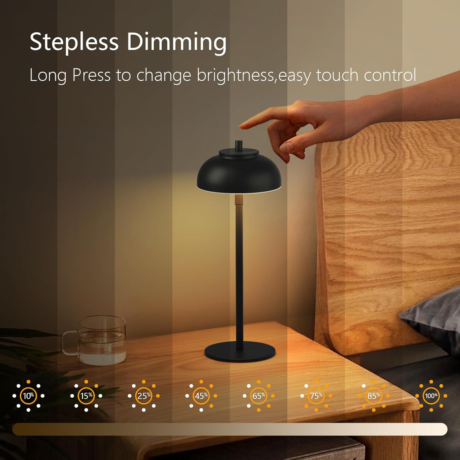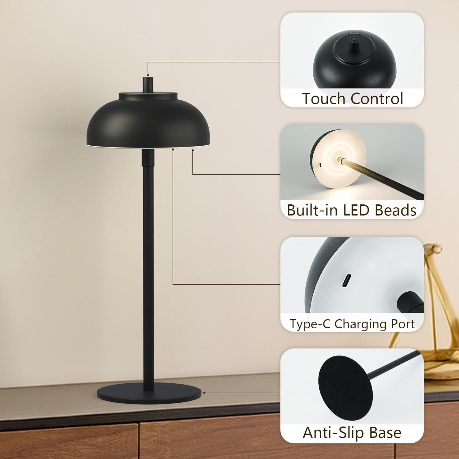 Cordless Table Lamps Rechargeable - 5000mAh Battery Operated 2 Pack, Black Product Details Finish Type: Black Base Material: Iron + Aluminum Bulb Base: E26 Medium Product Dimensions: 6"D x 10"W x 4"H Lamp Type: Table Lamp Shade Color: black Shade Material: Plastic Switch Type: Touch Style: Classic Brand: FenFud Color: Black Special Feature: Cordless Light Source Type: LED Material: Iron + Aluminum material Room Type: Living Room Recommended Uses For Product: Camping, Decoration Power Source: Battery Powered Shape: Round Controller Type: Touch Number of Light Sources: 1 Connectivity Technology: USB Included Components: Rechargeable Table Lamp USB Cable 2 x Shade Age Range (Description): Adult Is Waterproof: True Bulb Shape Size: A19 Mounting Type: Tabletop Number of Items: 2 Lighting Method: LED Control Method: Touch Specific Uses For Product: Camping, Picnic, Restaurant, Patio, Garden, Kitchen, Bedroom, Bar, Bathroom, Entry Desk, Decoration Water Resistance Level: Waterproof Installation Type: Tabletop Efficiency: Energy Efficient Is Cordless?: Yes Size: 2 Pack Manufacturer: FenFud Shade Height: 3 Inches Item Weight: 2.55 pounds Item model number: 2e7ace23-8c0c-44a4-87fd-696b8cb16339 Finish types: Black Special Features: Cordless Batteries Included?: No Batteries Required?: No Product Dimensions : 6 x 10 x 4 inches; 2.56 Pounds Item model number : 2e7ace23-8c0c-44a4-87fd-696b8cb16339 Manufacturer : FenFud Finish Type: Black Base Material: Iron + Aluminum Bulb Base: E26 Medium Product Dimensions: 6"D x 10"W x 4"H Lamp Type: Table Lamp Rechargable Battery Powered Table Lamp: Built-in 5000 mAh rechargeable battery, can be used for 20~42 hours, chargeable table lamp fully charged by USB C cable for 6 hours (also can be used while charging), this feature makes it a perfect LED portable desk lamp that save bills on batteries and electric. 3 Color Stepless Dimmable: This cordless table lamp provides 3 color temperature: Warm White, Neutral White, Cool White(3000K-5000K). Light touch to switch the color temperature. Long press to adjust the brightness, stepless dimming (10%-100%). Our led table lamp allows users to freely adjust the brightness and color according to different usage scenarios. Versatile Cordless Lamp: Say goodbye to cords! This lamp is designed to be cordless and can be powered by USB, giving you the freedom to use it anywhere. Whether you're camping, having a picnic, or enjoying a meal at a restaurant, this portable lamp serves as the perfect outdoor table companion. P65 Waterproof, Outdoor Use: FenFud outdoor table lamp cordless features an IP65 waterproof design, ensuring excellent water resistance. Lightweight and portable, an ideal lamp for indoor and outdoor like camping, patio, garden , kitchen, restaurant etc.