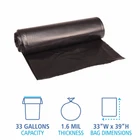 Can liner with equivalent strength of 2.0 mil liner. Perforated roll for easy dispensing. Coreless rolls save space and material. Commerical can liners have a super extra heavy duty grade with superior strength and performance. 10 bags per roll. Bags are perforated for easy dispensing. Bags have a star-sealed bottom to distribute the garbage weight evenly. 10 can liners per roll. 10 rolls per carton. 100 total bags. Bags are 33" x 39" and made of low-density polyethylene (LDPE) material. Can liners have a 33 gallon capacity and 1.6 mil thickness.